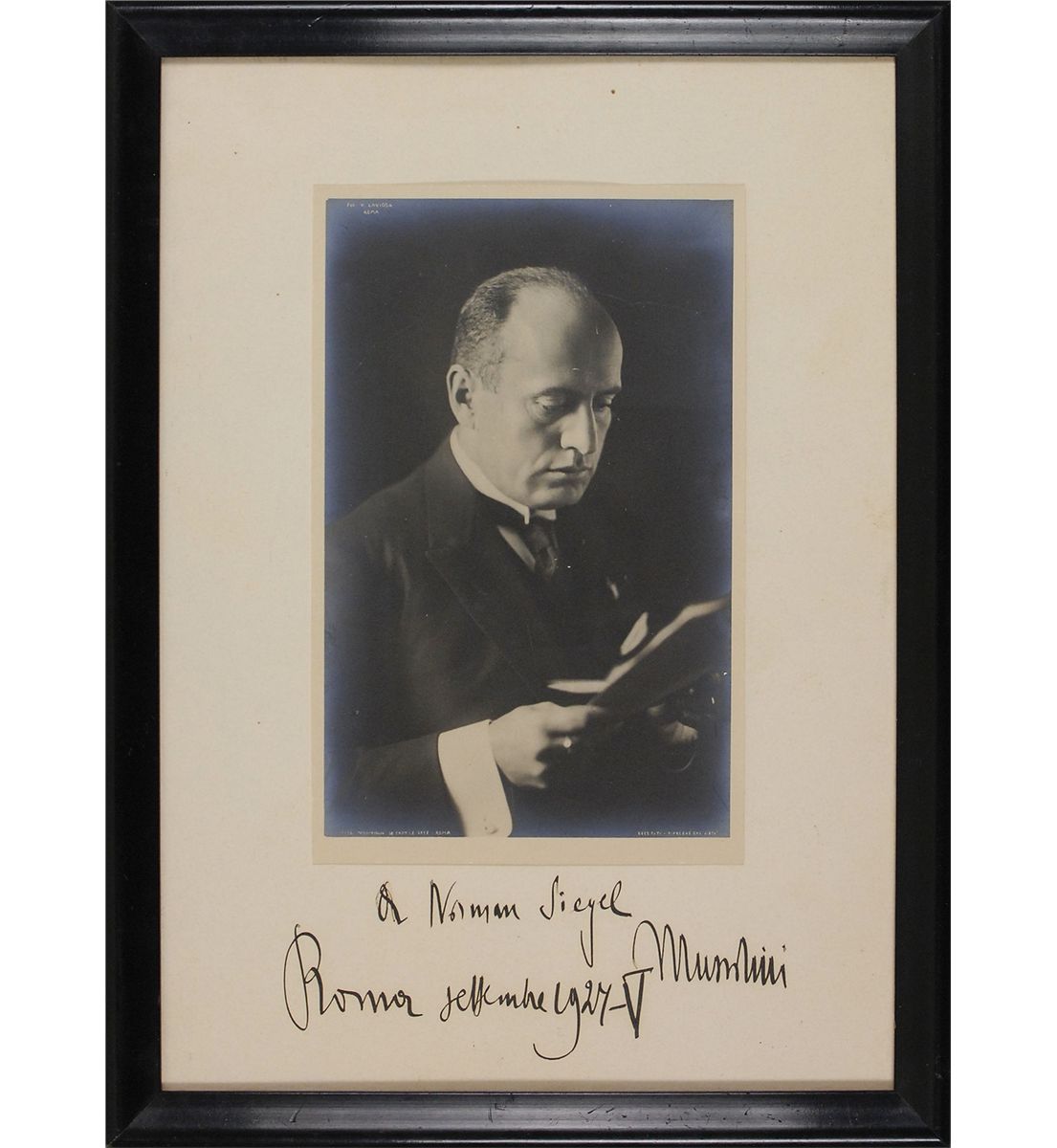 Vintage matte-finish 5.75 x 9 portrait of Mussolini reading affixed to an off-white 9.75 x 13.5 mount, signed and inscribed on the mount in black ink, “A Norman Siegel, Mussolini, Roma, settembre 1927-V.” Framed to an overall size of 11 x 15. In fine condition. Accompanied by an enlarged and framed newspaper article, in part: “A personal greeting to President Cooldige from Benito Mussolini, premier of Italy, was conveyed to the president today by Norman Siegel, a reporter for The Cleveland Press, who is in Washington en route to Cleveland after spending several months in Europe.”