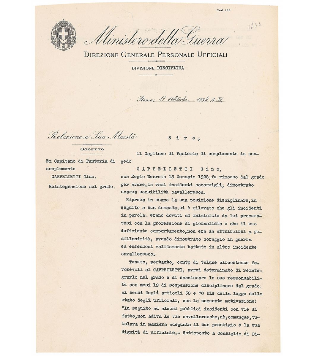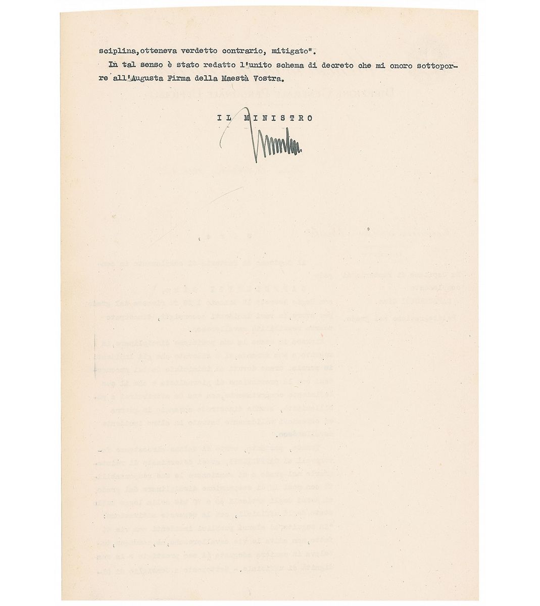 DS in Italian, signed “Mussolini,” one page, 9.5 x 13.5, September 11, 1934. Untranslated document regarding the re-integration of a cavalry officer that had been dismissed for refusing to accept a duel. In fine condition.