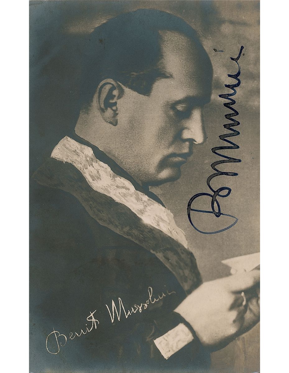 Uncommon matte-finish 5.25 x 3.25 postcard photo of Mussolini in profile, signed vertically in bold black ink, “B. Mussolini.” In fine condition, with mild silvering to dark areas of the image.