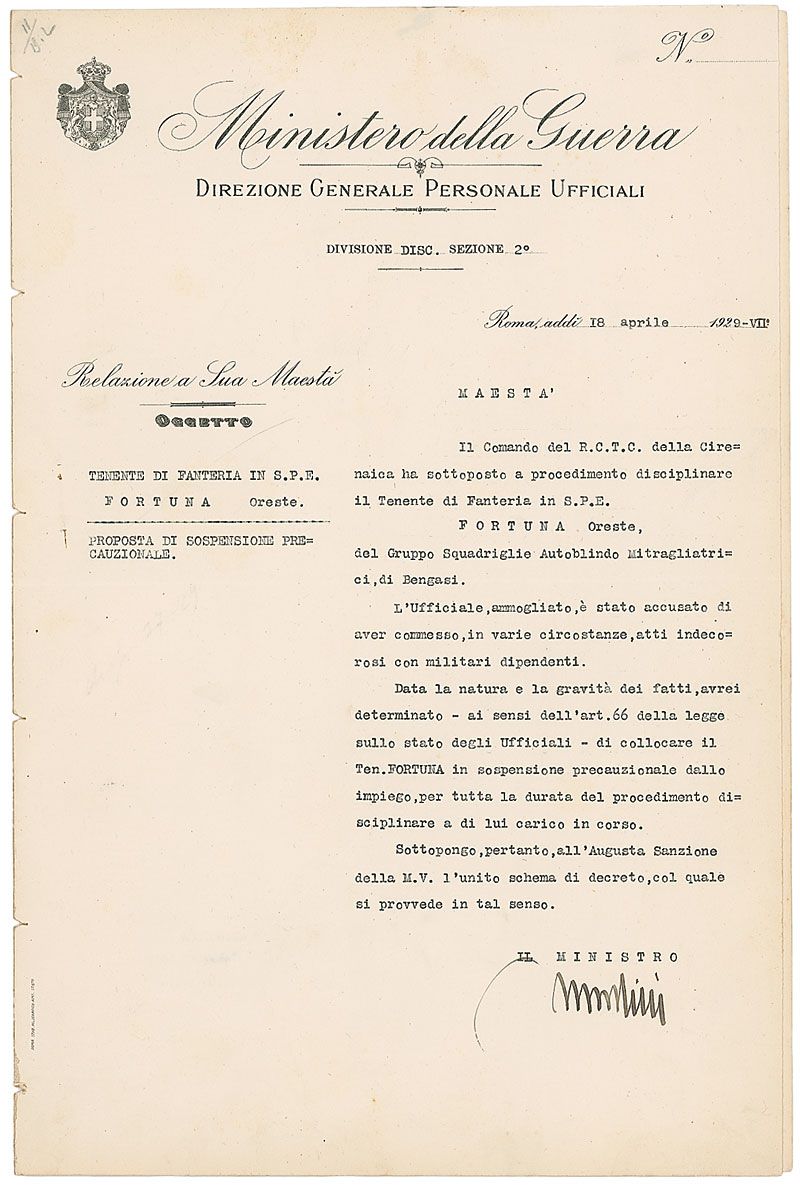 DS in Italian, signed “Mussolini,” one page, 9.5 x 14.5, April 18, 1929. Untranslated decree, boldly signed at the conclusion. In fine condition, with a central horizontal fold, expected notations, and marginal binding holes to left edge.