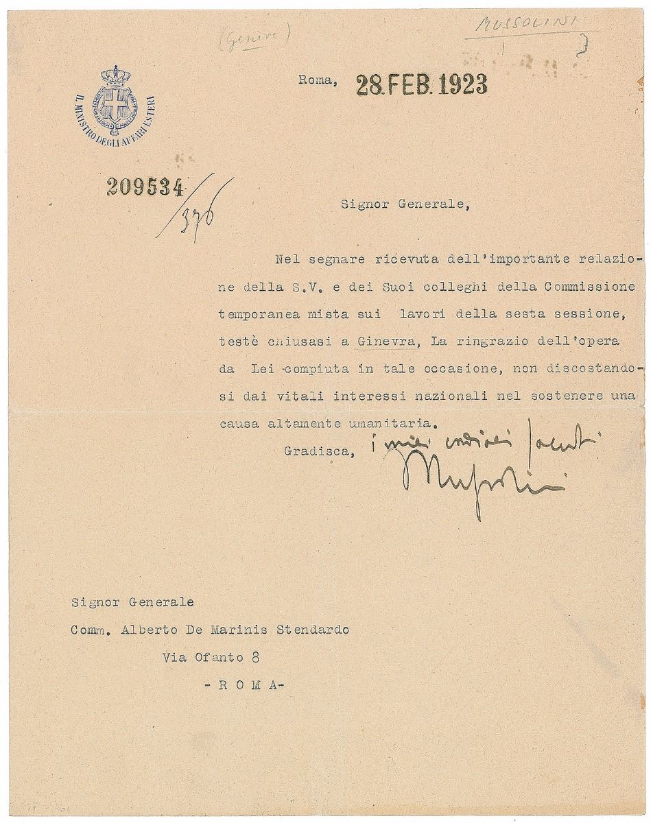 Untranslated TLS in Italian, signed “Mussolini,” one page, 7.75 x 9.75, Ministry of Foreign Affairs letterhead, February 28, 1923. In fine condition.