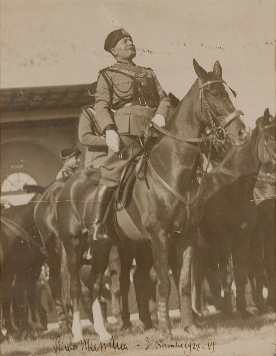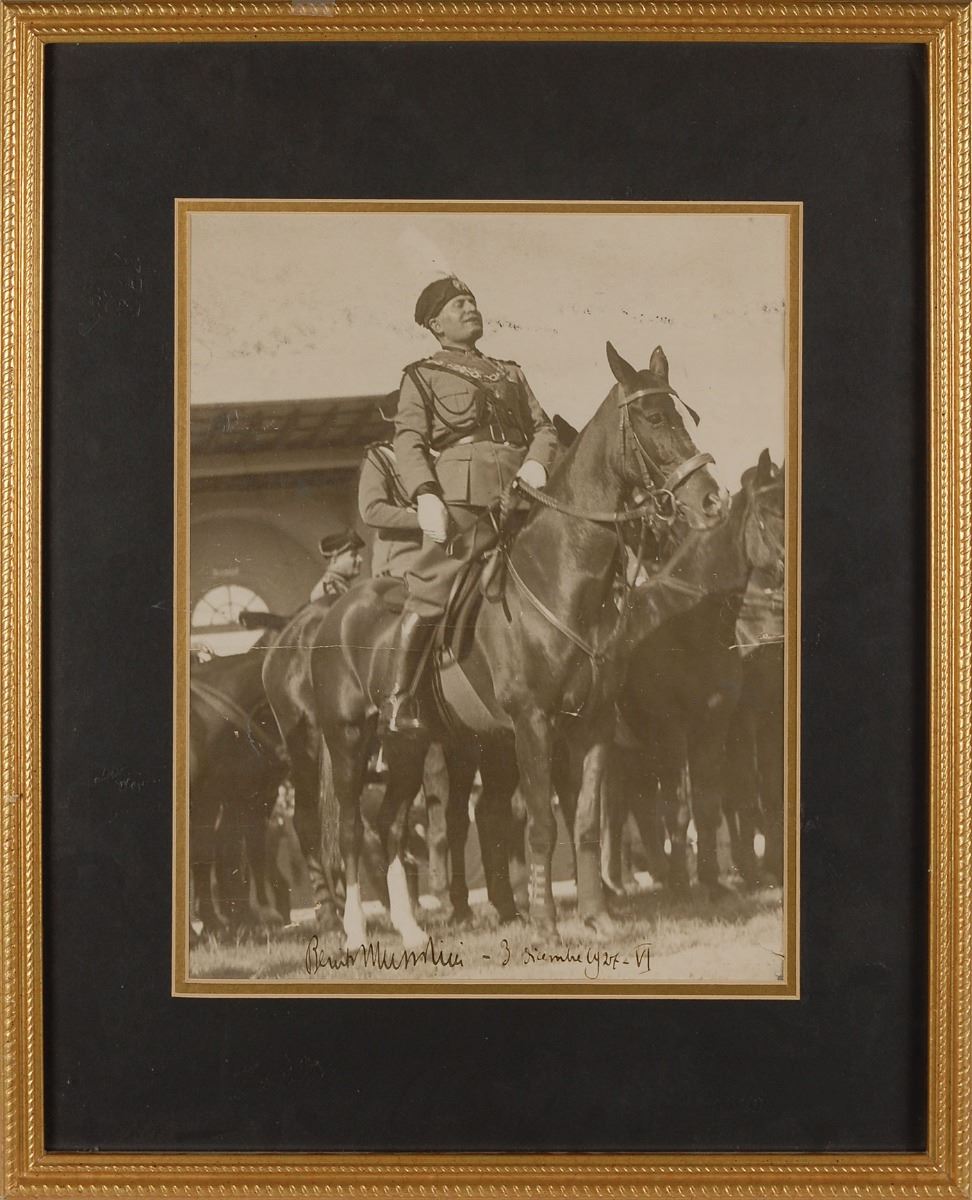 Vintage matte-finish 10.5 x 13.5 full-length portrait of Mussolini sitting proudly atop his horse, signed in fountain pen, “Benito Mussolini—3 dicembre 1927—VI.” Double-matted and framed to an overall size of 17.25 x 21.25. In very good condition, with soiling to the top, silvering to darker areas, overall light rippling and creasing, and small tears to the edges and to the horse’s chest. Consignor notes that this photo previously hung in a government office in Italy.