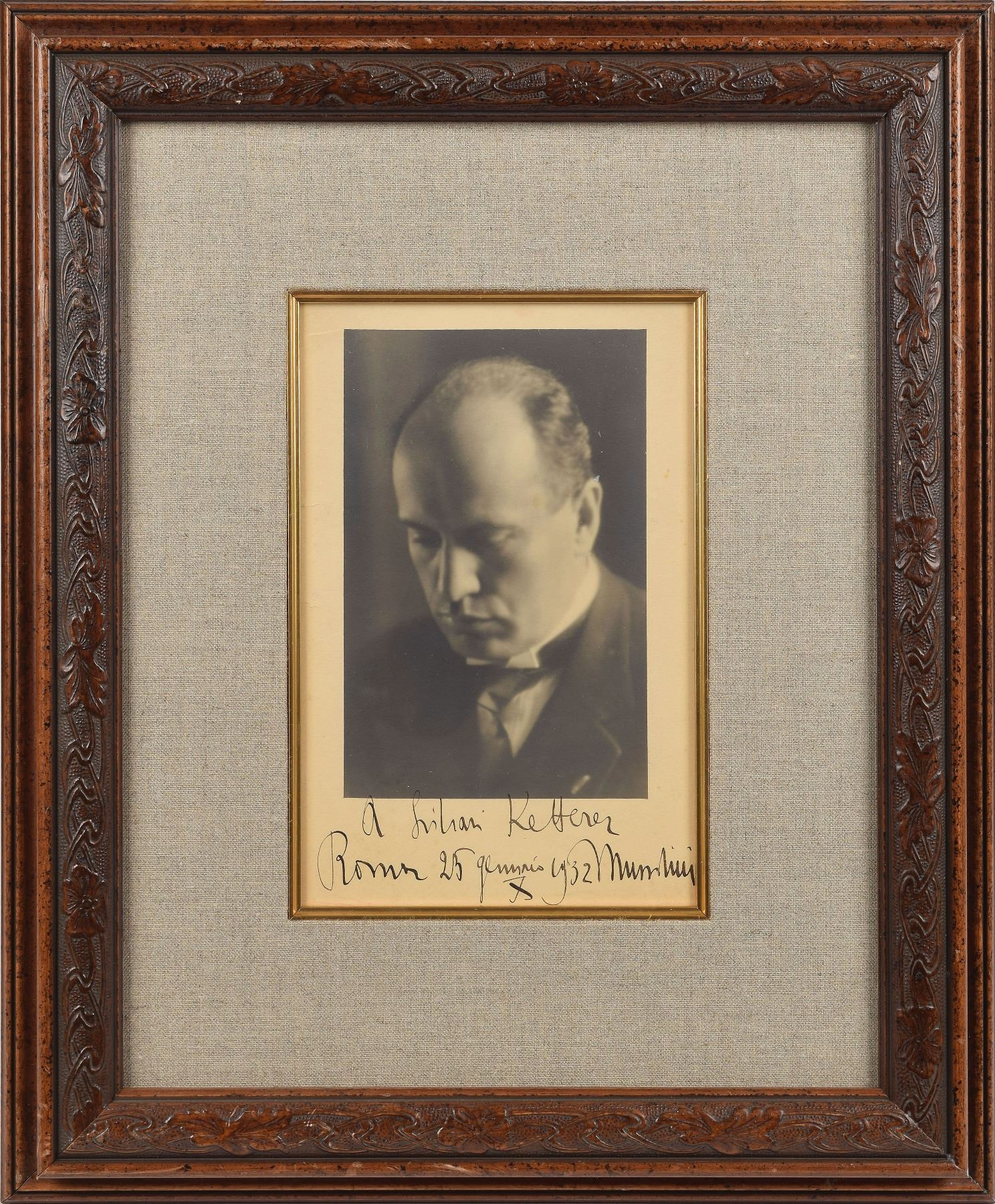 Handsome matte-finish 6.5 x 10 soft-focus portrait of Mussolini, boldly signed and inscribed in the lower border in fountain pen, and dated at Rome, January 25, 1932. Nicely cloth-matted and framed to an overall size of 16.75 x 20. In fine condition.