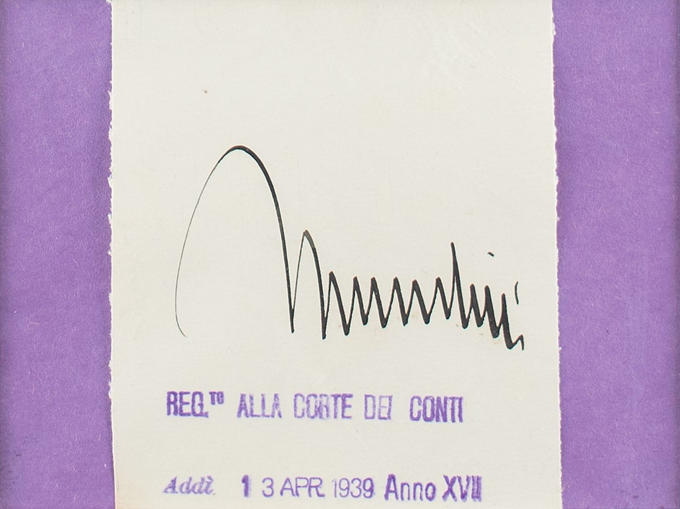 Fountain pen signature, "Mussolini,” on an off-white 3 x 3.75 sheet dated April 3, 1939. Matted with a portrait to an overall size of 11 x 14. In fine condition.