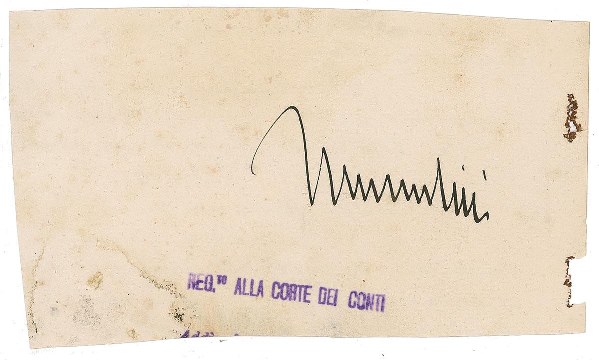 Bold fountain pen signature, “Mussolini,” on an off-white 6 x 3.5 slip cut from a larger document. In very good condition, with moderate soiling, scattered toning, and rust around staple holes at the right edge.