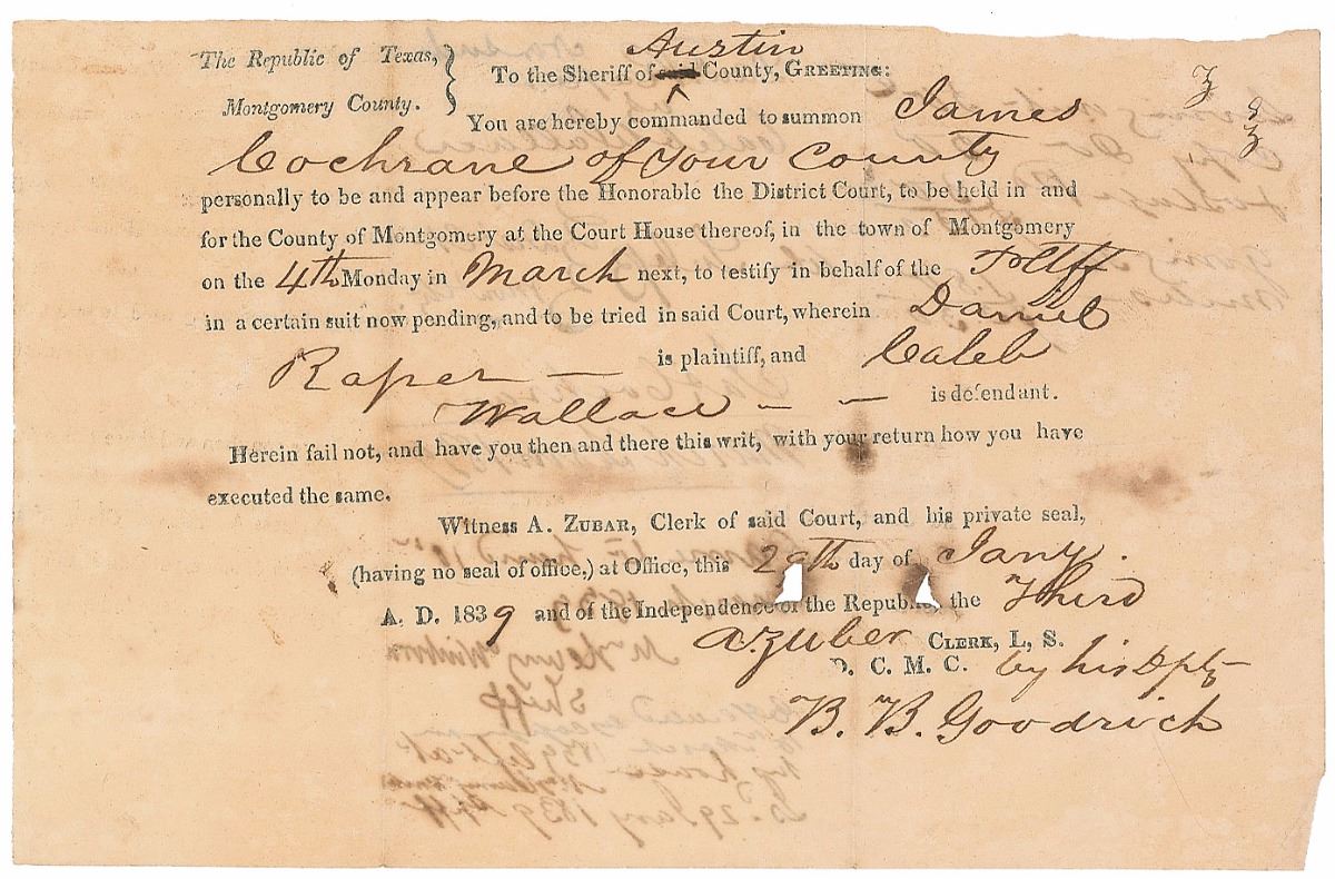 Signer of the Texas Declaration of Independence (1799–1860). Partly-printed DS, signed “B. B. Goodrich,” one page, 7.75 x 5, January 29, 1839. Court summons, in part: “To the Sheriff of Austin County…You are hereby commanded to summon James Cochrane of your County personally to be and appear before the…District Court.” In very good condition, with a couple edge separations to intersecting folds, two small holes to the body, scattered staining, and show-through from docketing to reverse. Provenance: The Robert Davis Collection.