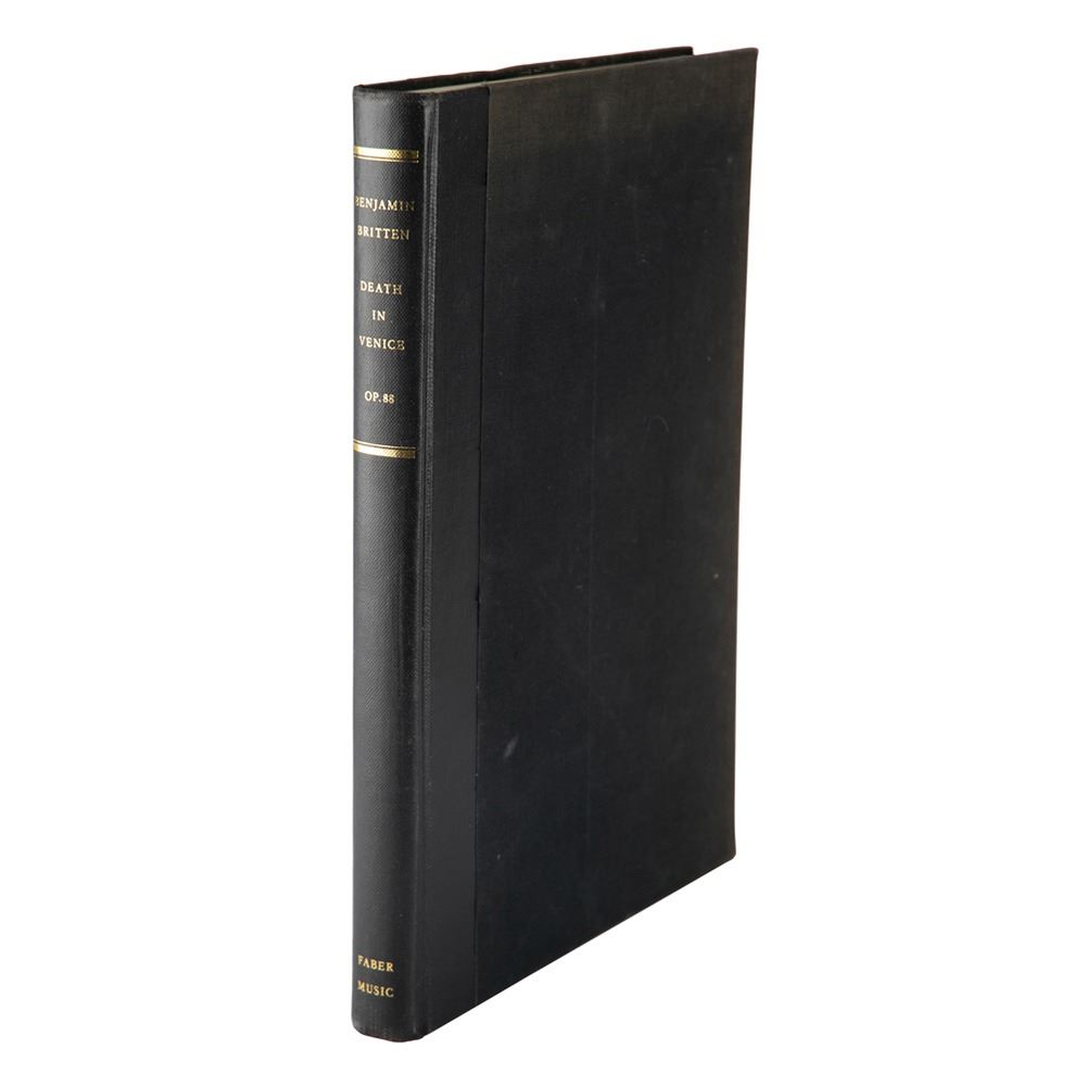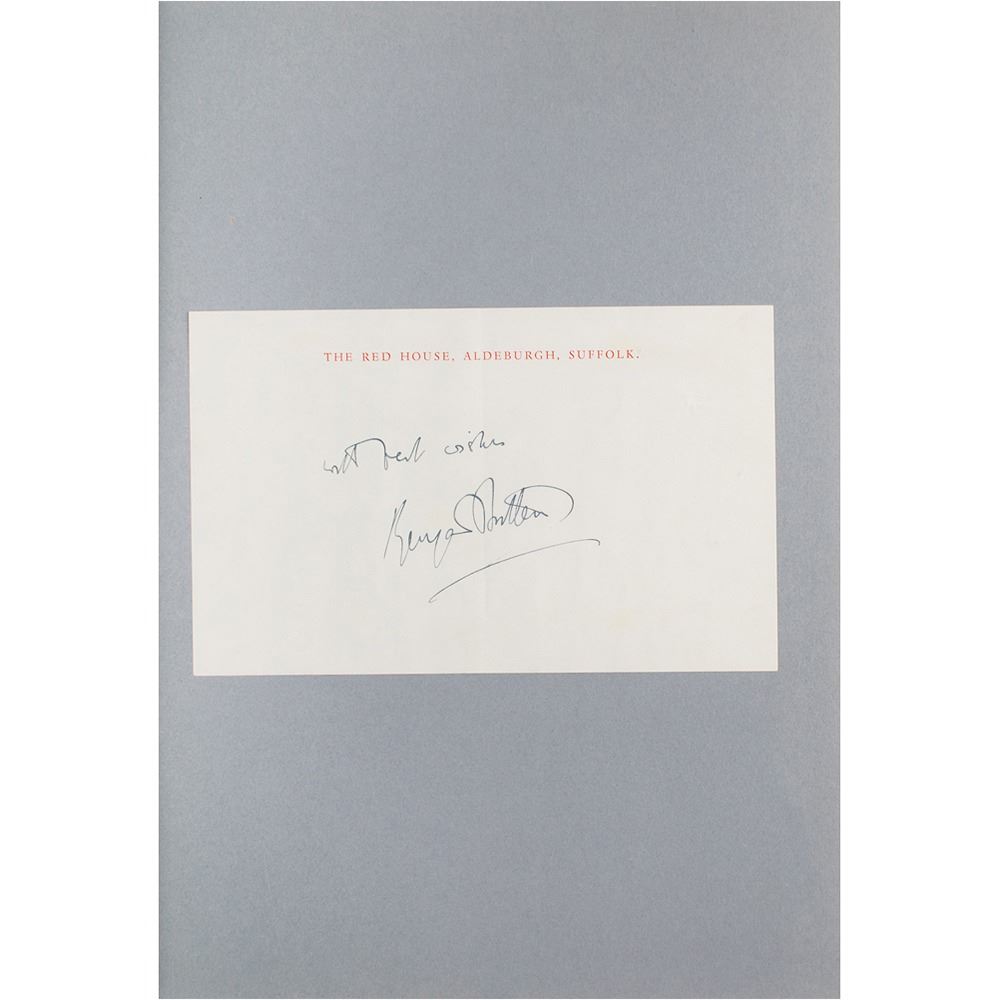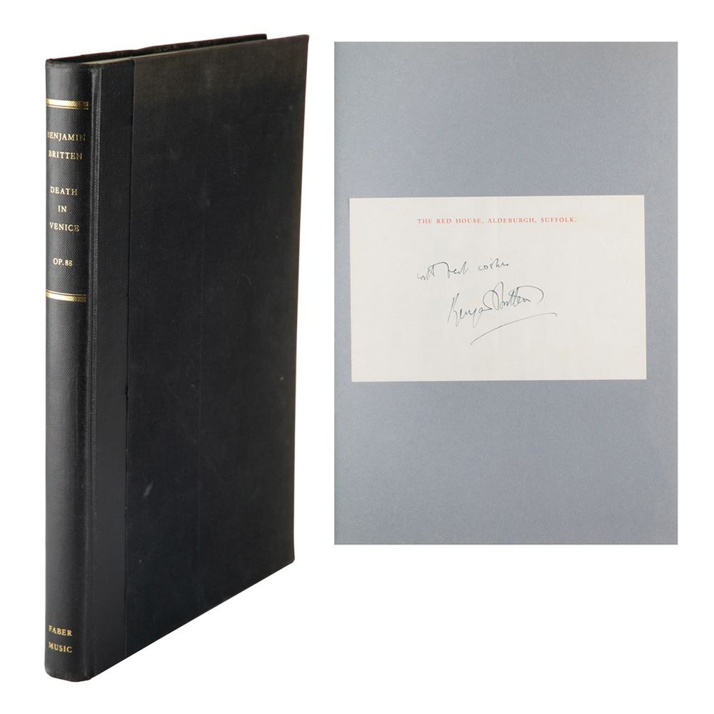 Vintage fountain pen signature, "With best wishes, Benjamin Britten,‰Û on an off-white 8 x 5 sheet of "The Red House, Aldeburgh, Suffolk" stationery, affixed to the first free end page of a 1979 hardcover edition of his score for Death in Venice, published in London by Faber Music Limited. In fine condition, with slight wrinkling to the signed sheet.