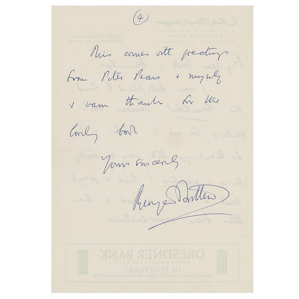 Two items: an ALS signed "Benjamin Britten," four pages on two adjoining sheets, 5.75 x 8.25, Park Hotel letterhead, in part: "I was delighted to find the beautiful Vermeer book waiting for me in Köln & I do thank you both very sincerely. He is a painter I like a great deal & it is so good to have these fine reproductions…we give concerts tomorrow (28th) in Essen (Gr. Saal des Städt-Saalbaues) & Thursday (29th) in Dusseldorf (Robert Schumann Saal)—both at 8 p.m. Could you both come to one of these? I am sure we could get you tickets if you just arrive there—or you could let us know at the Park Hotel—Dusseldorf. It would be so nice to see you. Yes I do know Richter the pianist. He is a wonderful & sympathetic man, & a fabulous, if rather eccentric, pianist. He plays a lot with my great friend, the cellist Rostropovich, the best cellist I have ever heard. I am so glad you have heard & admire Richter. This comes with greetings from Peter Pears & myself"; and fountain pen signatures, "Benjamin Britten" and "Peter Pears," on a peach 3.75 x 2 album page, signed on the reverse by composer Arnold Bax. In fine condition.