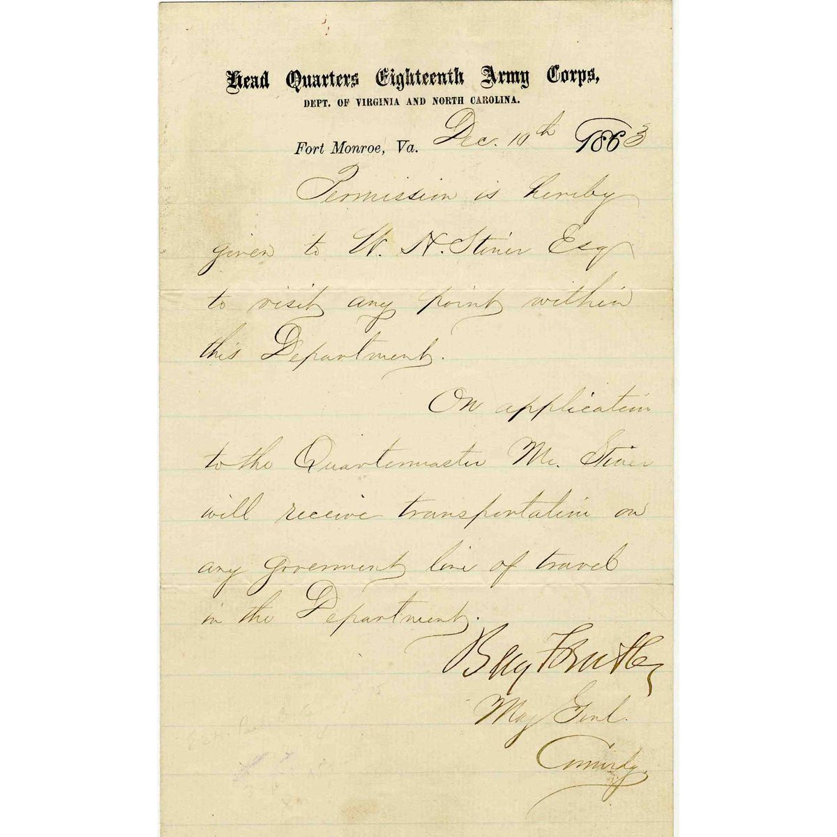 Document signed by General Benjamin ''Beast'' Butler dated 19 December 1863 as Commanding General of the Department of Virginia and North Carolina. Written upon official letterhead, Butler grants permission to a W.H. Stiner, Esq. to visit and tour the Department. Signed ''Benj F Butler'' at conclusion of 5'' x 8'' folded document. In very good condition with 1'' separation along fold, not visible. Bold, distinct signature by Butler.
