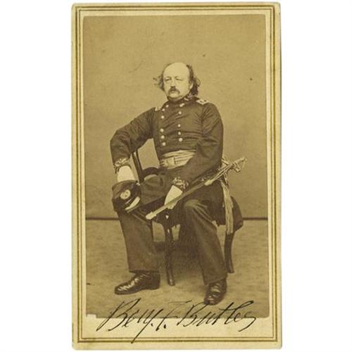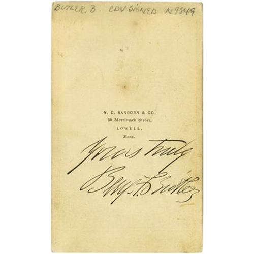 <B>General Benjamin F. Butler: A Rare Double-Signed <I>Carte de Visite.</B></I></B></I> A fine Civil War image of the notorious "Beast Butler" of North Carolina, Sanborn & Company of Lowell, Massachusetts. Bold autograph at bottom, and another signed "<I>Yours Truly</B></I>" on verso. Signed photos of this important general, and later famous political gadfly, are quite rare. The Sanders Guide lists no price for a signed photo, either of Civil War or later vintage, suggesting no published auction records. Excellent condition.<BR><BR><b>Shipping:</b> Small Flat (<a target="_blank" href="http://www.heritageauctions.com/common/shipping.php">view shipping information</a>)