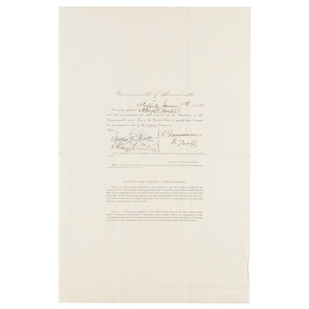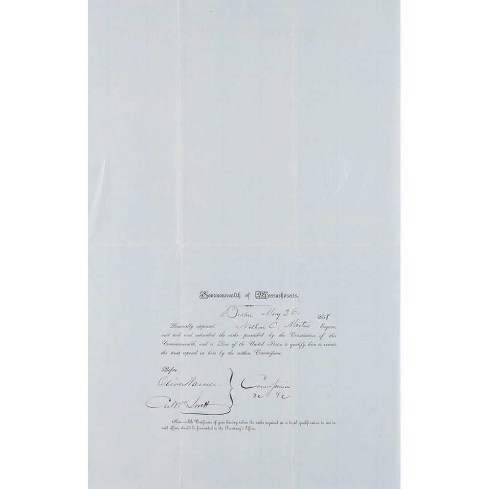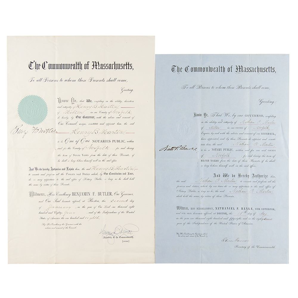 Two DSs by the Massachusetts governors, both of whom served with distinction in the Civil War: a partly-printed DS signed "Benj. F. Butler," one page, 11 x 17, January 2, 1884, appointing Henry B. Martin as a notary public; and a partly-printed DS signed "Nath. P. Banks," one page, 10 x 15.5, May 15, 1858, appointing Nathan P. Martin as a notary public. In overall fine condition, with partial splits to folds on the Banks document.