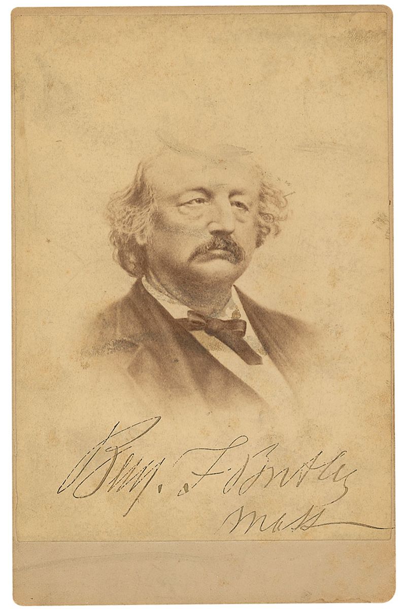 Original 4 x 6.5 cabinet photo by C. M. Bell of Washington, D. C., signed at the bottom of the image in black ink, “Benj. F. Butler, Mass.” In very good condition, with some irregular ink adhesion and skipping to signature and scattered surface marks, soi