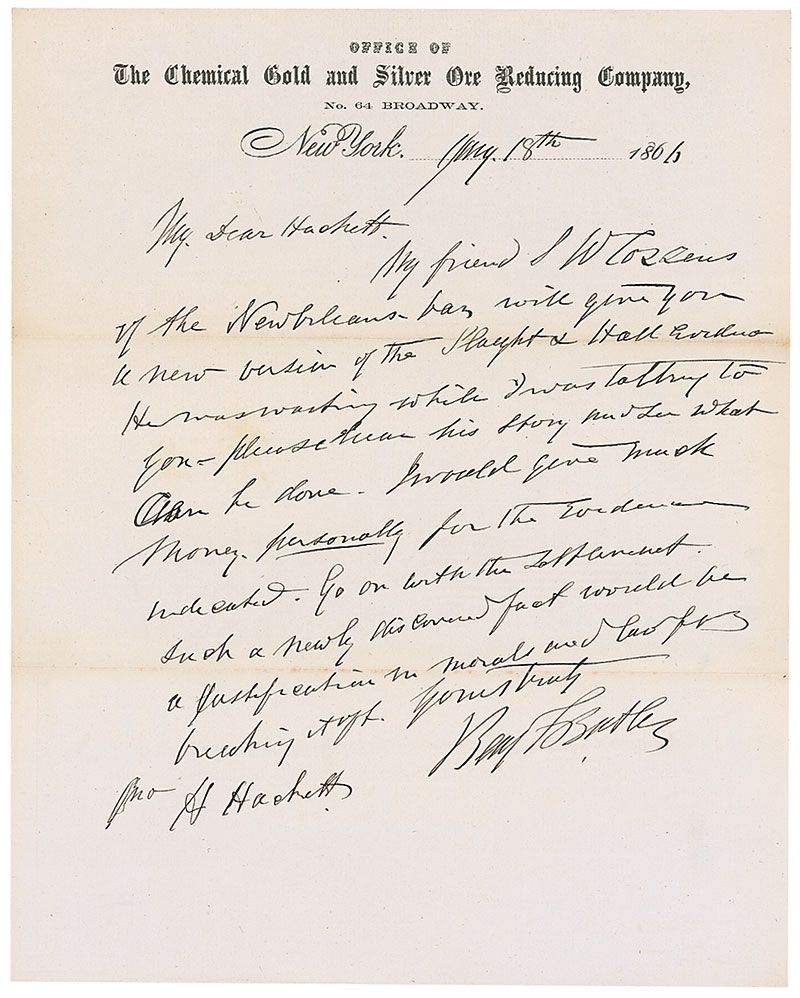 American military officer, lawyer, and politician (1818–1893) whose strict administration of New Orleans following the Union occupation in 1862 made him one of the most controversial figures of the Civil War. ALS signed “Benj. F. Butler,” one page, 8 x 10, The Chemical Gold and Silver Ore Reducing Company letterhead, January 18, 1866. Letter to a lawyer. In part: “My friend…of the New Orleans bar will give you a new version of the…evidence…please hear his story and see what can be done. I would give much money personally for the evidence…Go on with the settlement.” Intersecting folds (one vertical fold passing through a single letter of the signature), and light scattered toning, otherwise fine condition.