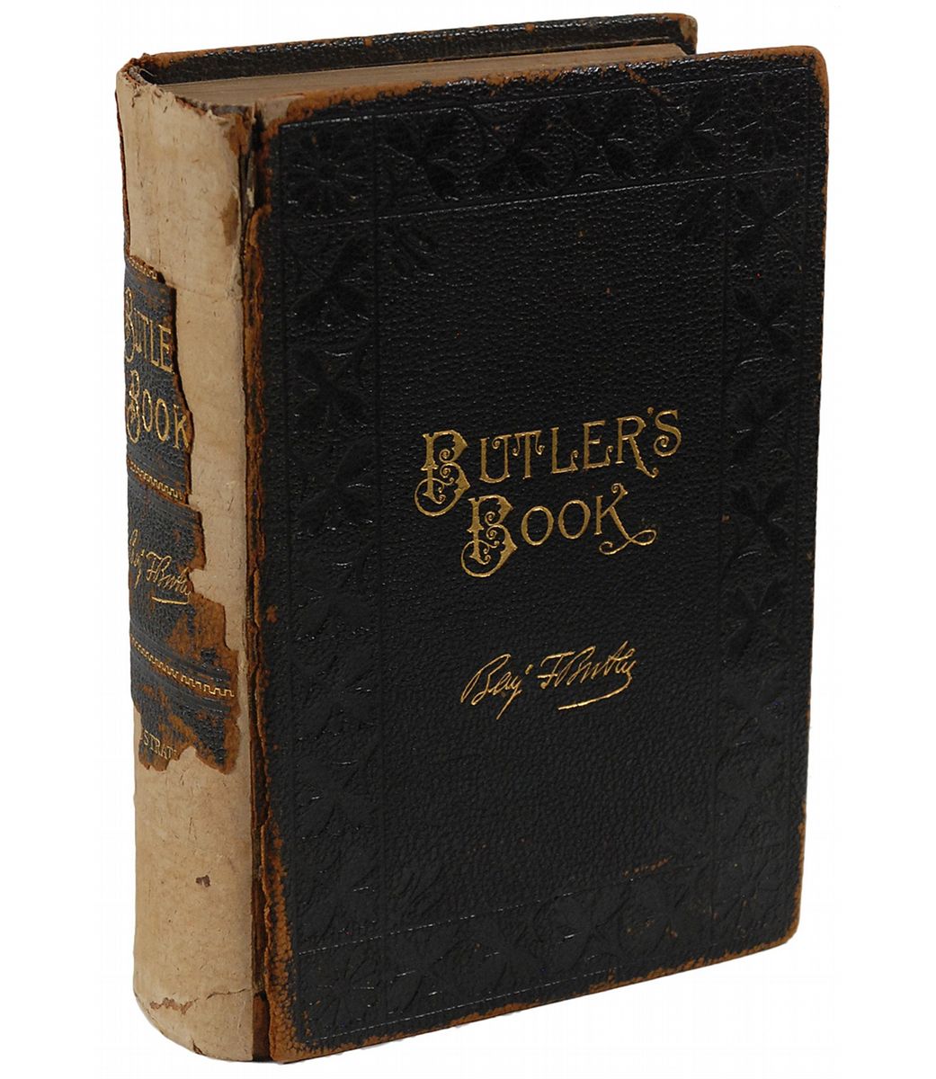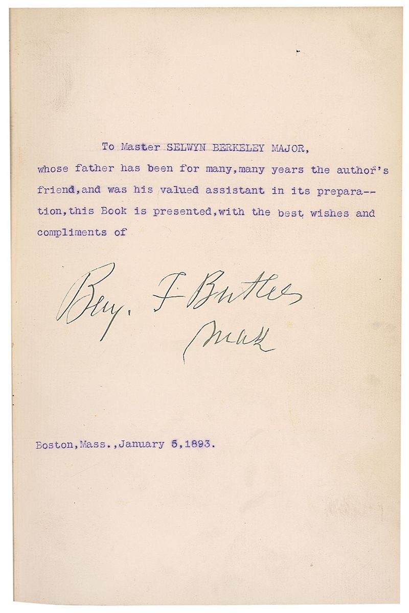 Signed book: Butler’s Book. Boston: A. M. Thayer, 1892. Hardcover, 7 x 9.75, 1154 pages. Inscribed in type on the first free end page, “To Master Selwyn Berkeley Major, whose father has been for many, many years the author’s friend, and was his valued assistant in its preparation, this Book is presented, with the best wishes and compliments of,” signed below in black ink, in black ink, “Benj. F. Butler, Mass,” and dated January 5, 1893. In very good condition, with significant surface loss to spine and cracked hinges.