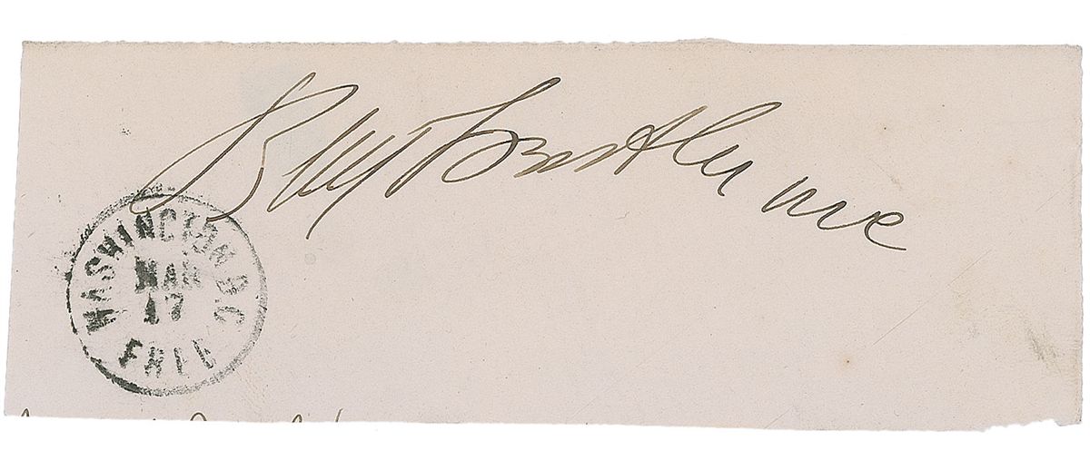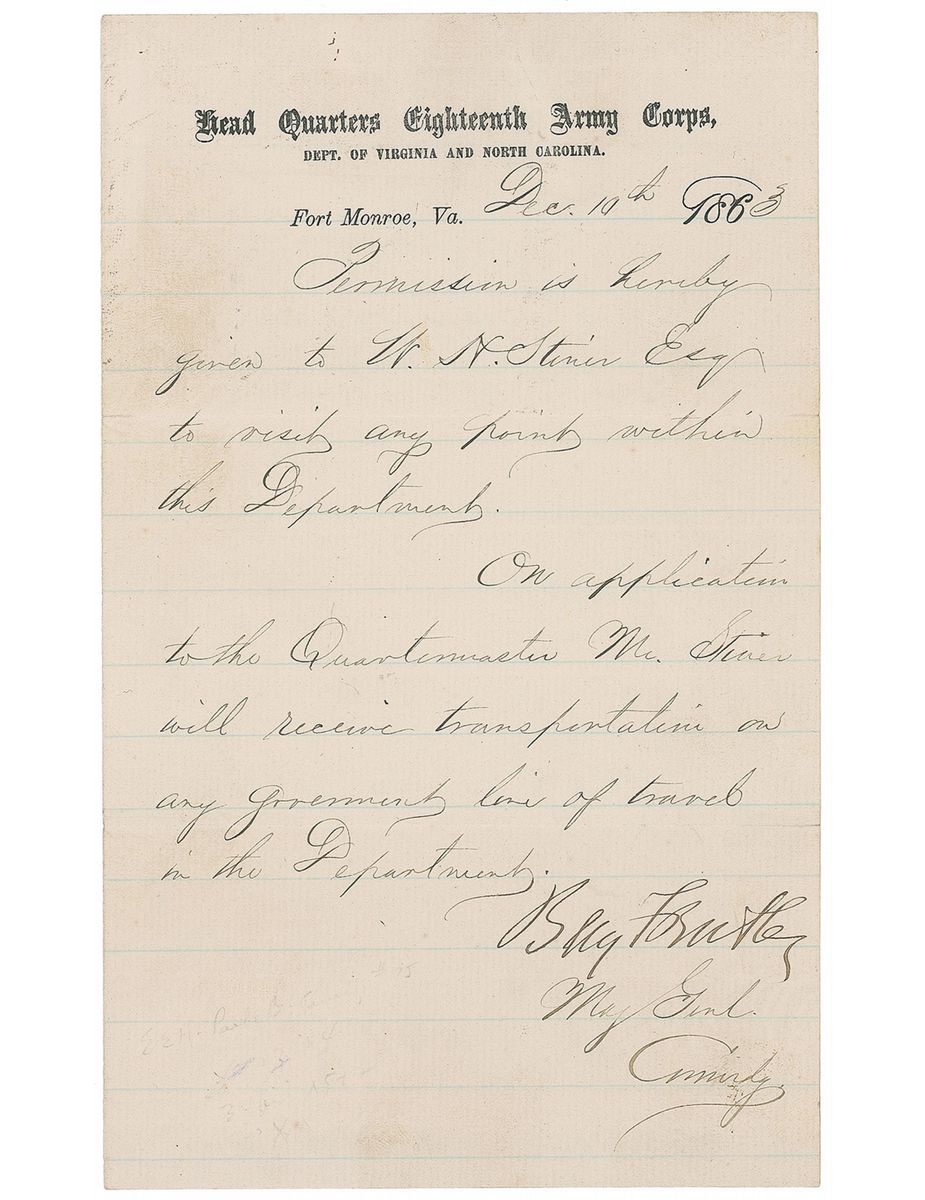 Two items: war-dated LS signed “Benj. F. Butler,” one page, 5 x 8, Head Quarters Eighteenth Army Corps letterhead, December 10, 1863, in part: “Permission is hereby given…to visit any point within this Department”; and an ink free frank signature, “Benj. F. Butler, MC,” on an off-white 4.75 x 1.75 slip clipped form a mailing envelope. In overall fine condition.