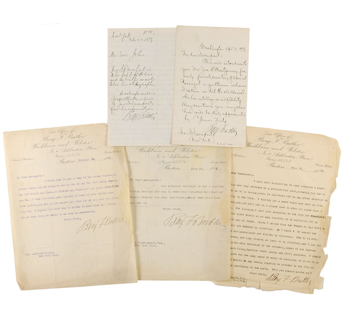 Collection of five items, each signed by Butler, including: an 1890 TLS concerning election law; an 1873 LS sent to introduce a gentleman who formerly served as private secretary to Admiral David Farragut; an 1886 TLS regarding an elevated railway; an 1888 TLS requesting Civil War–era copies of New York newspapers; and an endorsement signature on the reverse of an 1873 letter of recommendation for a man seeking a stenography job. In overall very good condition, with edge tears, creases, and staining to most.