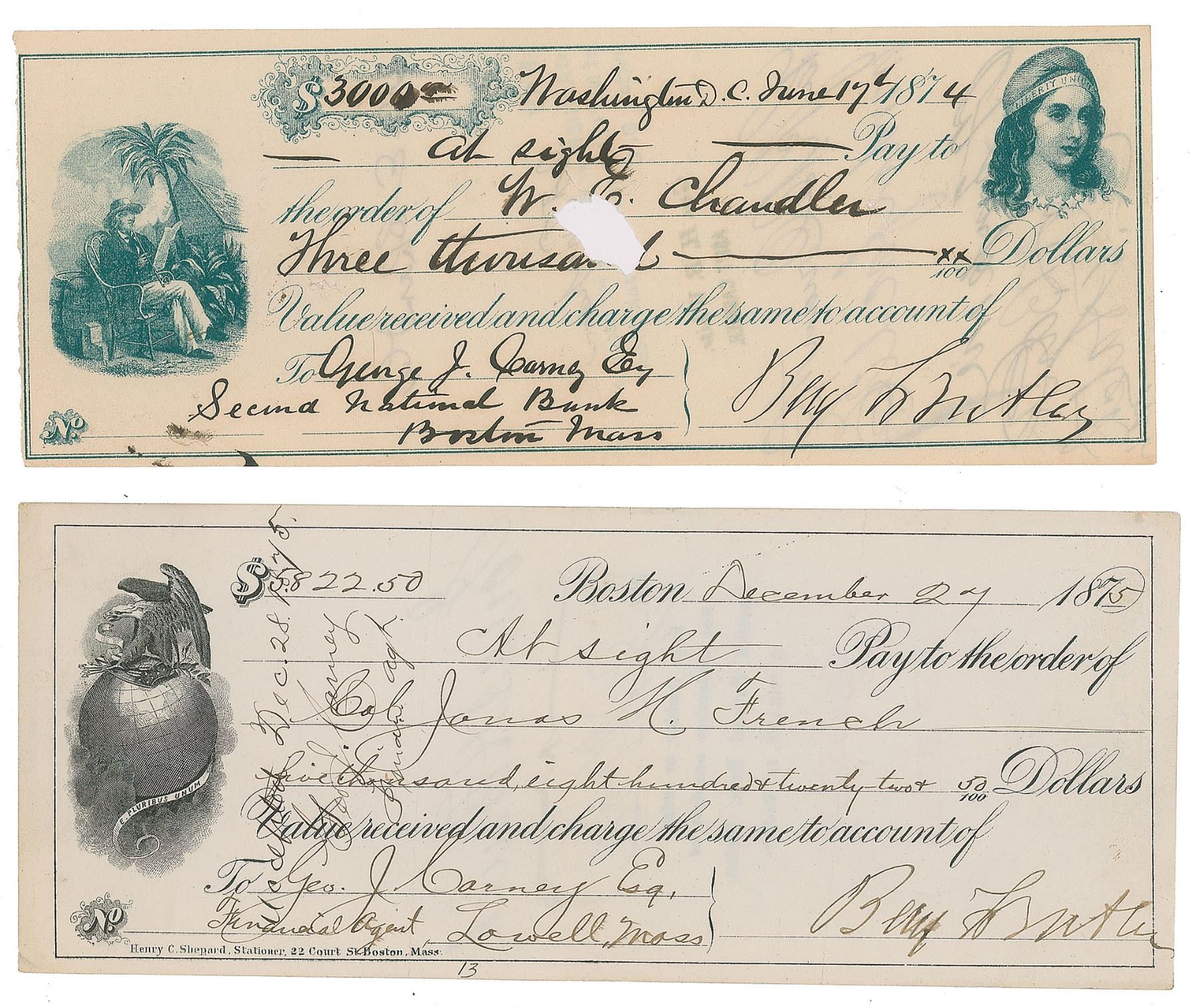 Two checks, each filled out in another hand and signed by Butler, "Benj. Butler," dated June 17, 1874 and December 27, 1875. The first is payable to future Secretary of the Navy William E. Chandler for $3,000 (endorsed by Chandler on the reverse), and the second is payable to Col. Jonas H. French, a Union officer who had served as acting military mayor of New Orleans for two weeks in 1862. In overall very good to fine condition.