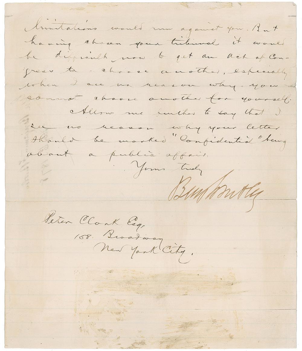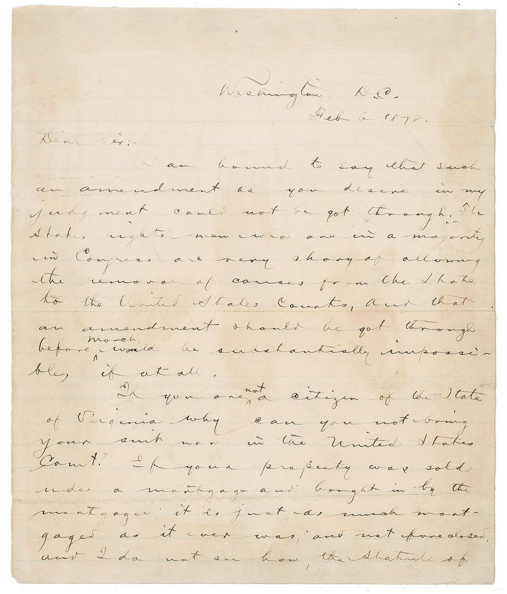 American military officer, lawyer, and politician (1818–1893) whose strict administration of New Orleans following the Union occupation in 1862 made him one of the most controversial figures of the Civil War. His mismanagement as a general ultimately led to his resignation in 1865, followed, naturally, by a long career in Congress. LS signed “Benj. F. Butler,” two lightly-lined pages, 8 x 9.5, February 6, 1876. In full: “I am bound to say that such an amendment as you desire in my judgment could not be got through. The States rights men who are in a majority of Congress are very chary of allowing the removal of causes from the State to the United States Courts, and that an amendment should be got through before March would be substantially impossible if at all. If you are not a citizen of the State of Virginia why can you not bring your suit now in the United States Court? If your property was sold under a mortgage and bought in by the morgagee, it is just as much mortgaged as it ever was, and not foreclosed, and I do not see how the Statute of limitations would run against you. But having chosen your tribunal it would be difficult now to get an Act of Congress to choose another, especially when I see no reason why you cannot choose another for yourself. Allow me further to say that I see no reason why your letter should be marked ‘Confidential’ being about a public affair.” In very good condition, with creasing, scattered irregular toning, and rippling and show-through from docketing and paste residue on the back.