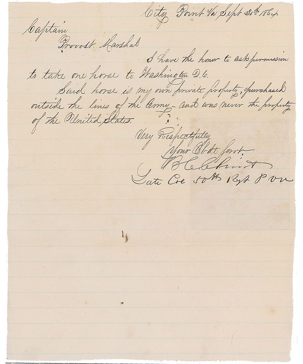 Union officer who commanded a brigade in the IX Corps of the Army of the Potomac at several important battles, including the Battle of Antietam (1824–1869). Civil War–dated LS signed “B. C. Christ, Late Col. 50th Rgt. PVV,” one page, lightly-lined, 7.25 x 9, City Point, Virginia, September 30, 1864. Letter to the provost marshal on the day he was mustered out of the Union army. In full: “I have the honor to ask permission to take one horse to Washington, D. C. Said horse is my own property, purchased outside the lines of the Army, and was never the property of the United States.” Affixed to reverse is a partly-printed slip approving the request. Professionally inlaid into a slightly larger sheet. In fine condition, with scattered creases and light soiling. This is the first item we have offered from this Union officer.