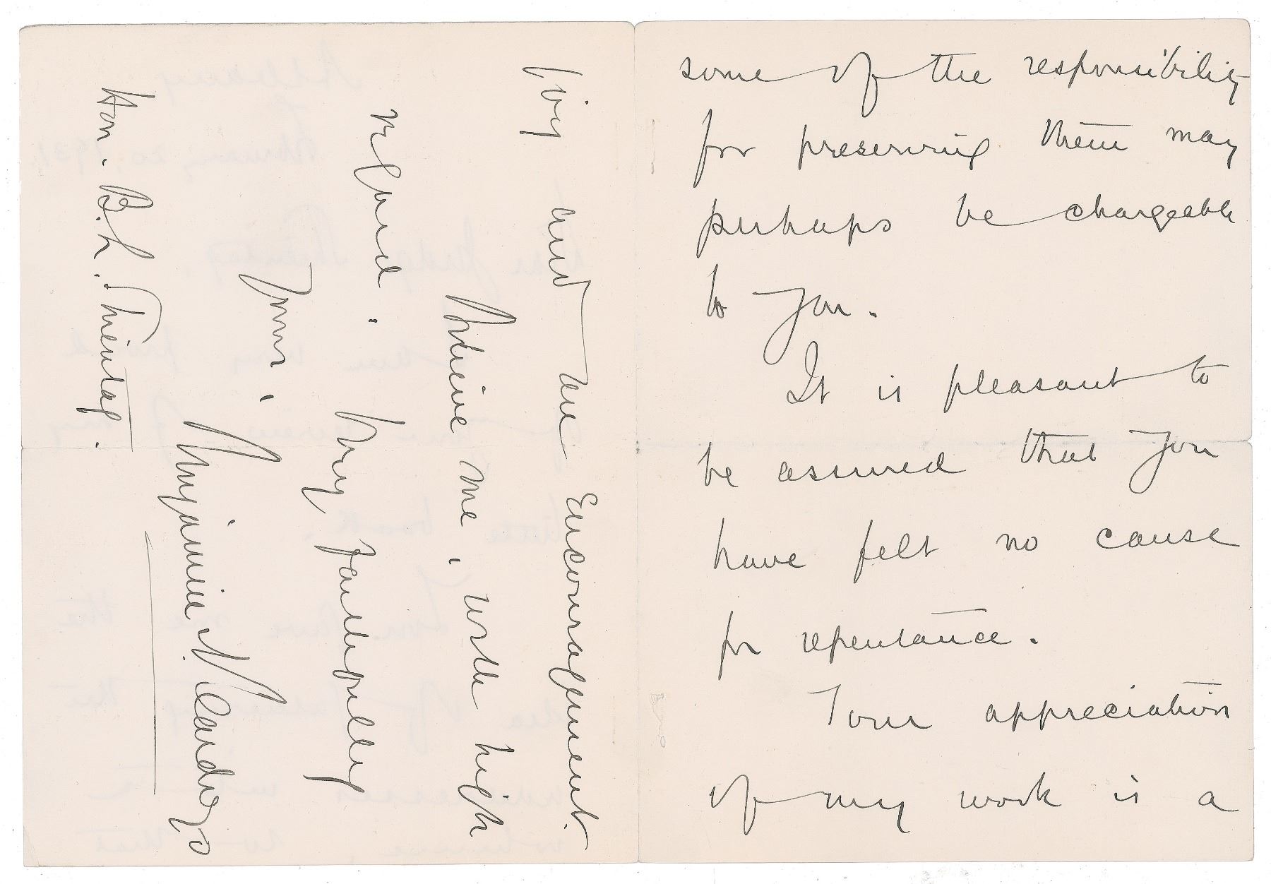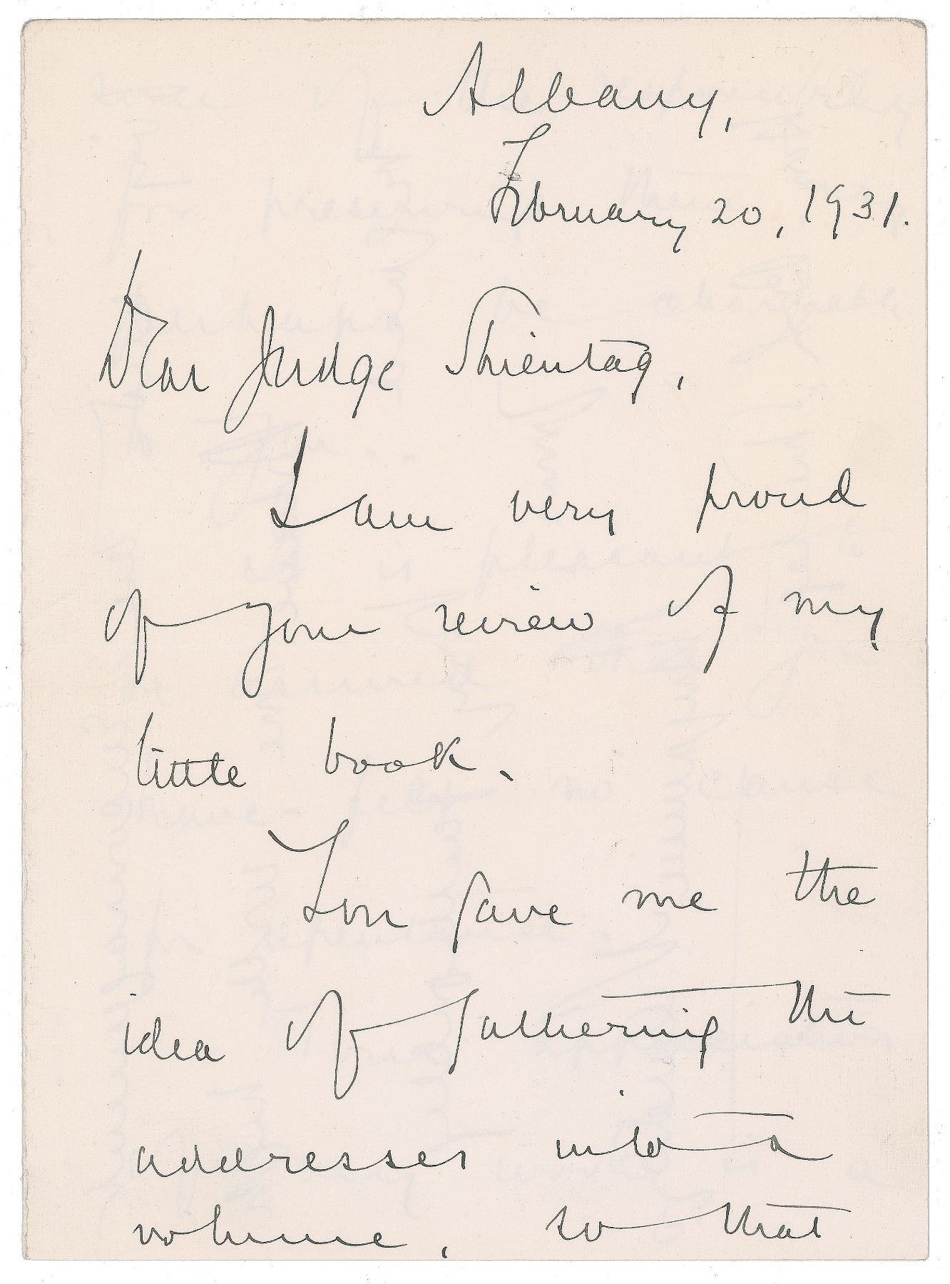 ALS, three pages on two adjoining sheets, 5.75 x 8, February 20, 1931. Letter to a judge, in part: "I am very proud of your review of my little book. You gave me the idea of fathering the addresses into a volume, so that some of the responsibility for preserving them may perhaps be chargeable to you. It is pleasant to be assured that you have felt no cause for repentance. Your appreciation of my work is a joy and an encouragement." In very good to fine condition, with light creasing, and staple holes along the left edge of the second page. In 1931, Harcourt, Brace and Company published Cardozo's 'Law and Literature,' a collection of essays and addresses.