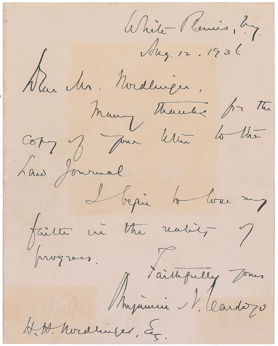 ALS signed “Benjamin N. Cardozo,” one page, 5 x 6.5, August 12, 1936. Brief letter to H. H. Nordlinger, in full: “Many thanks for the copy of your letter to the Law Journal. I begin to lose my faith in the reality of progress.” Staple holes to upper right and three irregular blocks of toning, otherwise fine condition.