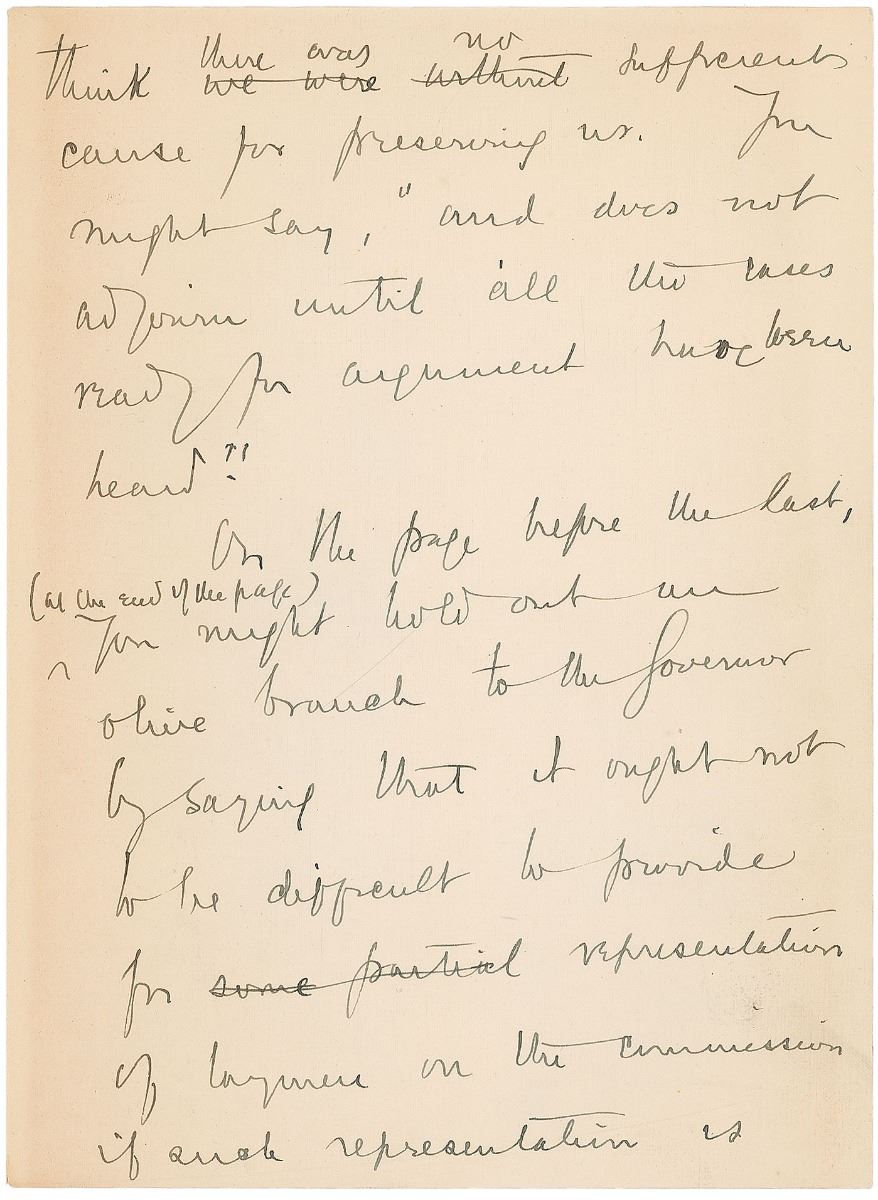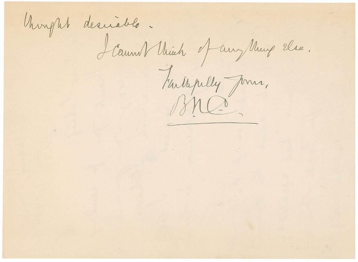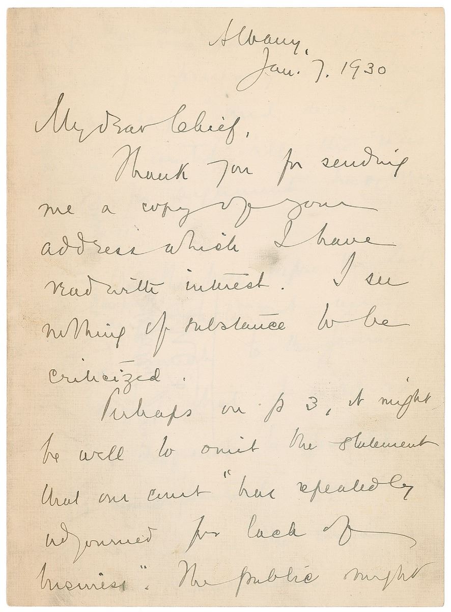 ALS signed “B. N. C.,” three pages on two adjoining sheets, 5.75 x 8, January 7, 1930. Letter to Frank S. Hiscock, Cardozo’s predecessor as chief judge of the New York Court of Appeals. In full: “Thank you for sending me a copy of your address which I have read with interest. I see nothing of substance to be criticized. Perhaps on p. 3, it might be well to omit the statement that our court ‘has repeatedly adjourned for lack of business.’ The public might think there was no different cause for preserving us. You might say, ‘and does not adjourn until all the cases read for argument have been heard.’ On the page before the last, (at the end of the page) you might hold out an olive branch to the Governor [Franklin D. Roosevelt] by saying that it ought not to be difficult to provide for representation of laymen on the commission if such representation is thought desirable. I cannot think of anything else.” In fine condition.