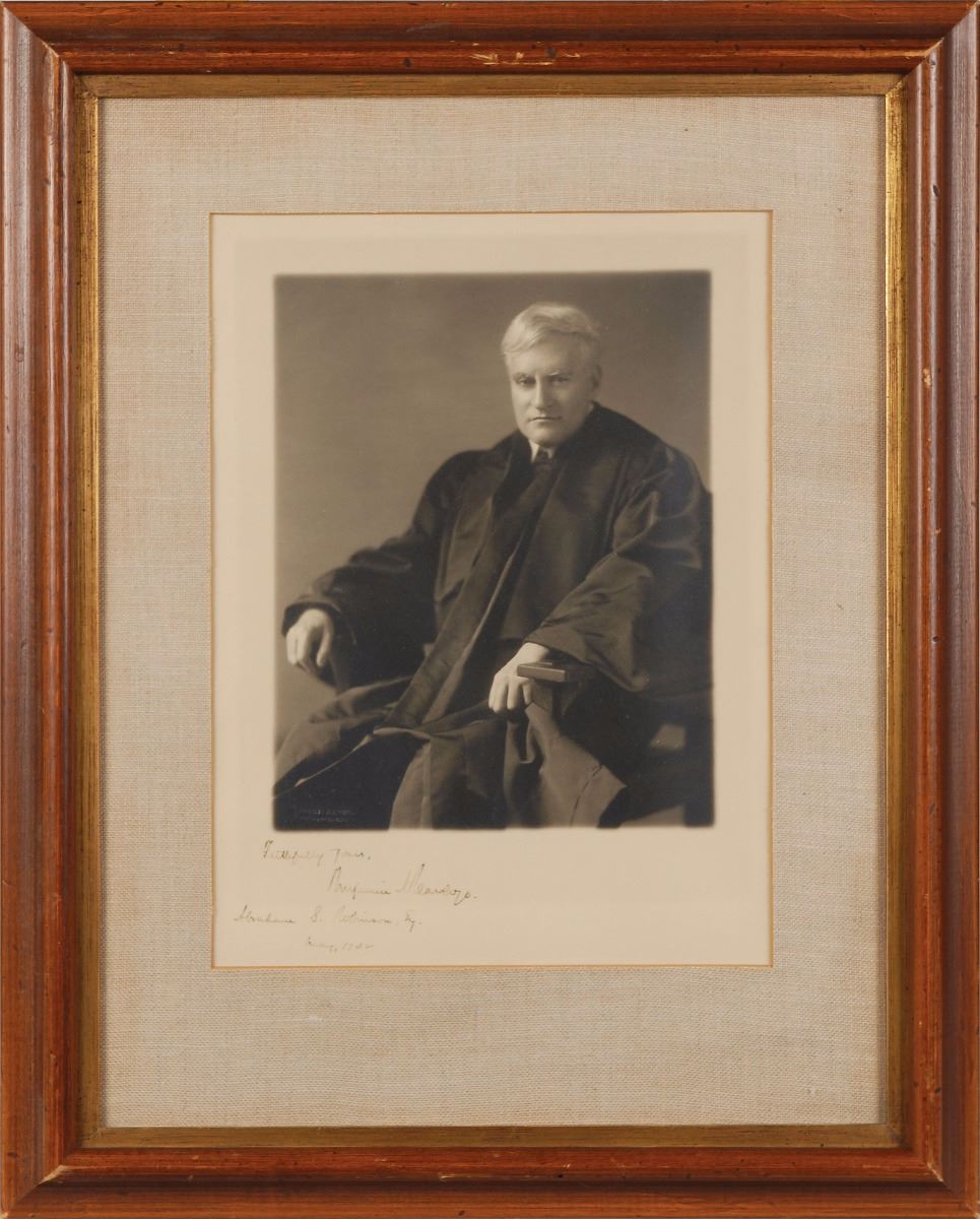 Vintage matte-finish 9 x 12.25 seated portrait of Justice Cardozo by Harris & Ewing, signed and inscribed in the lower border in fountain pen, “Faithfully yours, Benjamin Cardozo, Abraham S. Robinson, Esq., May, 1932.” Cloth-matted and framed to an overall size of 15.75 x 19.75. In fine condition, with light rippling.