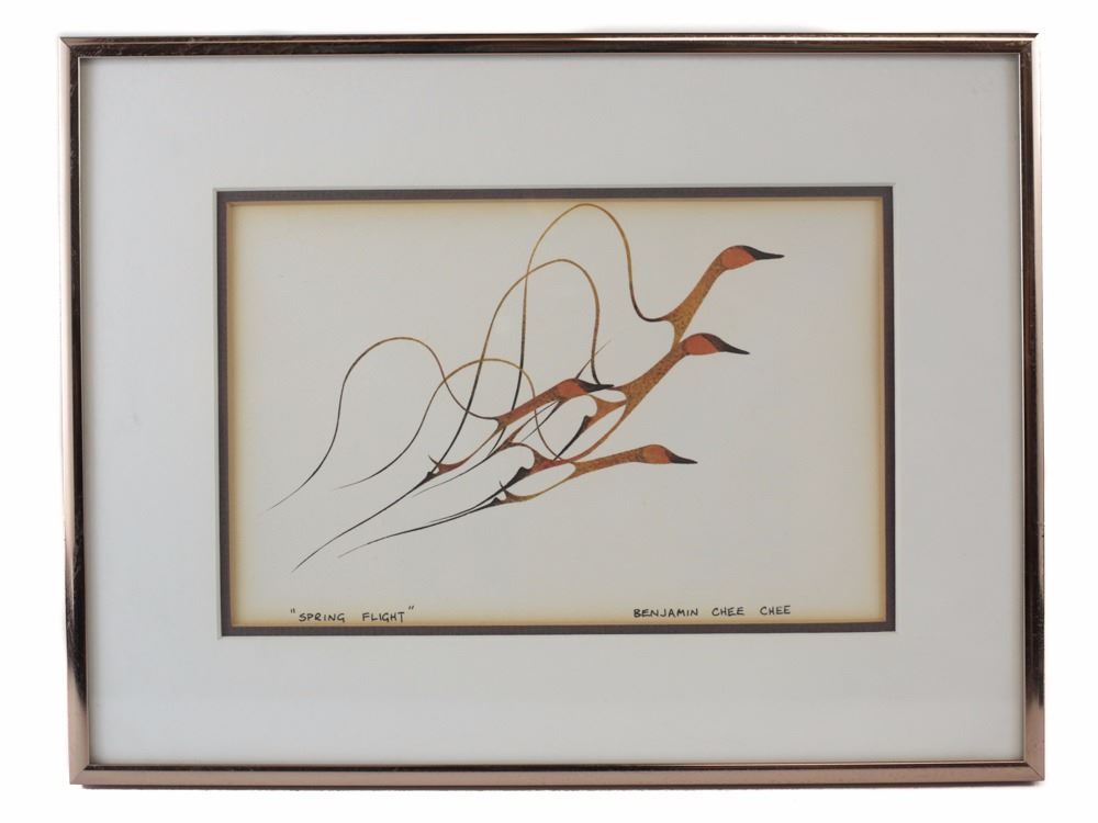 A framed watercolor on paper titled "Spring Flight" by American artist Benjamin Chee Chee (1944-1977). Signed Benjamine Chee Chee (lower right)