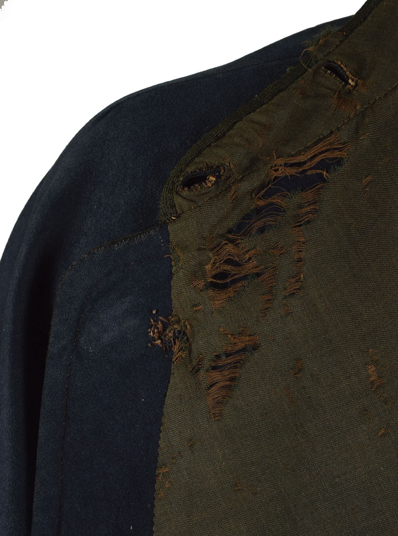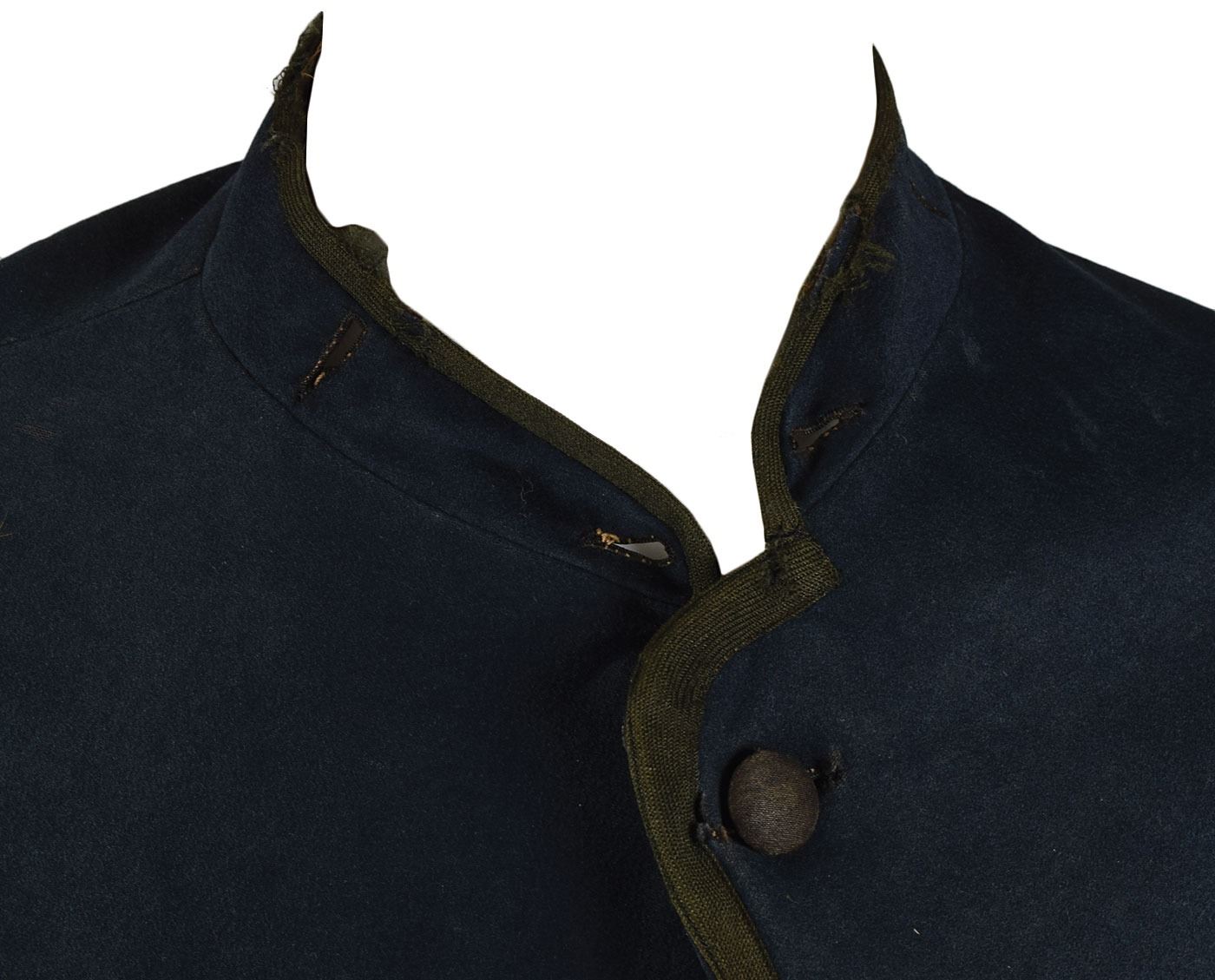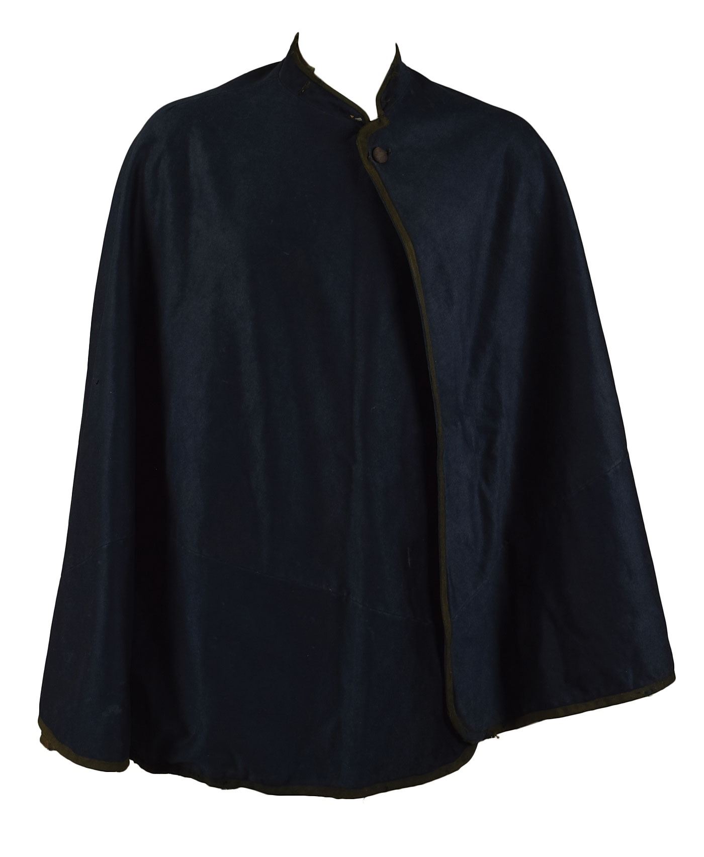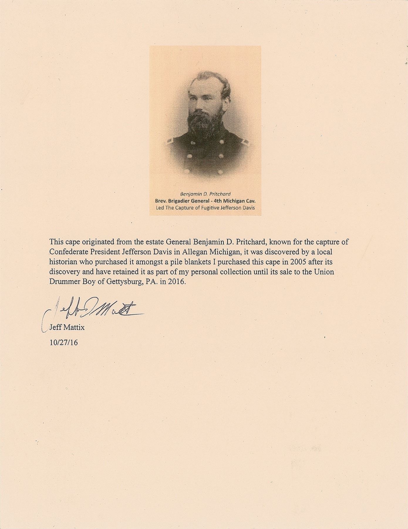 Impressive deep navy blue Union cape identified to Benjamin D. Pritchard, who is remembered as one of the four men who captured Confederate President Jefferson Davis. The high-quality cape is constructed of a dark blue wool broadcloth exterior with gray fabric lining, and gray piping along the edges. The closure is a single black toggle button at the neck, and the collar has decorative buttonhole-style slits. In fine condition, with minor fraying and losses to the lining; overall this is an extremely well-preserved piece. Accompanied by a letter of provenance stating that this was purchased from Pritchard's estate in 2005. Also includes a packet of reference materials on Pritchard and his regiment.