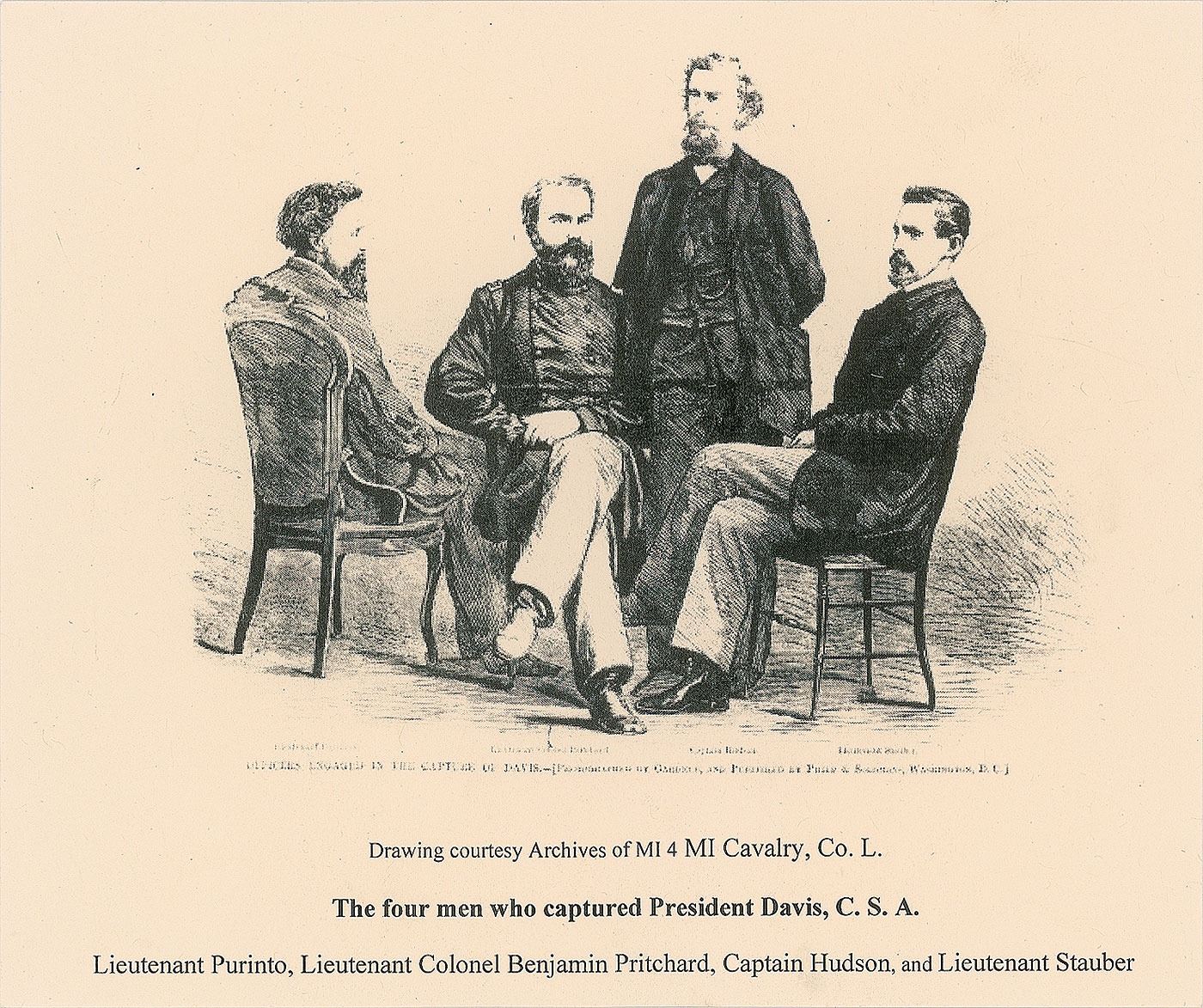 On May 10, 1865, the fugitive Jefferson Davis was captured by the Fourth Michigan Cavalry, commanded by Lt. Col. Benjamin D. Pritchard. In an episode that soon took hold amongst the nation's political cartoonists, the Confederate president was found attempting to flee in a woman's cloak. As his reward for making the capture, Colonel Pritchard was brevetted out of service as a brigadier general and received a $3000 share of the bounty which President Andrew Johnson had offered for Davis's apprehension. A fantastic piece of Civil War history.