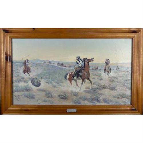 7767 Benjamin Dewey Titsworth (1898-1970) Oil on Canvas "Roping a Wolf" 1949 20" x 36" Exhibited at the Colorado Springs Fine Art Center 1974