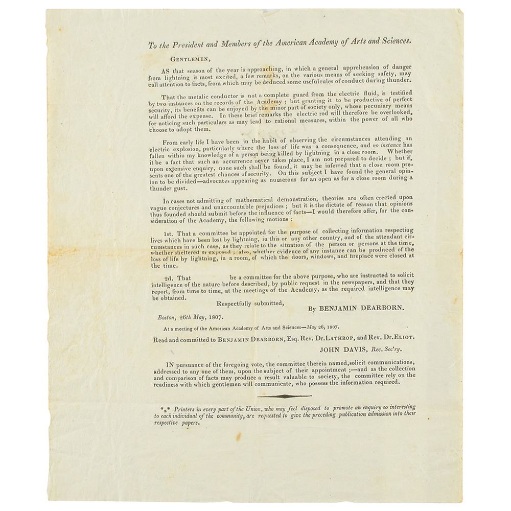 Printed letter, one page, 8.25 x 9.75, May 26, 1807. A letter to the "President and Members of the American Academy of Arts and Sciences," in which Benjamin Dearborn proposes to study the effects of lightning and methods of seeking safety from strikes. In part: "As the season of the year is approaching, in which a general apprehension of danger from lightning is most excited, a few remarks, on the various means of seeking safety, may call attention to facts, from which may be deduced some useful rules of conduct during thunder. That the metallic conductor is not a complete guard from the electric fluid, is testified by two instances on the records of the Academy…From early life I have been in the habit of observing the circumstances attending an electric explosion, particularly where the loss of life was a consequence, and no instance has fallen within my knowledge of a person being killed by lightning in a close room…it may be inferred that a close room presents one of the greatest chances of security." In very good condition, with overall creasing and wrinkling, and light toning along the intersecting folds.