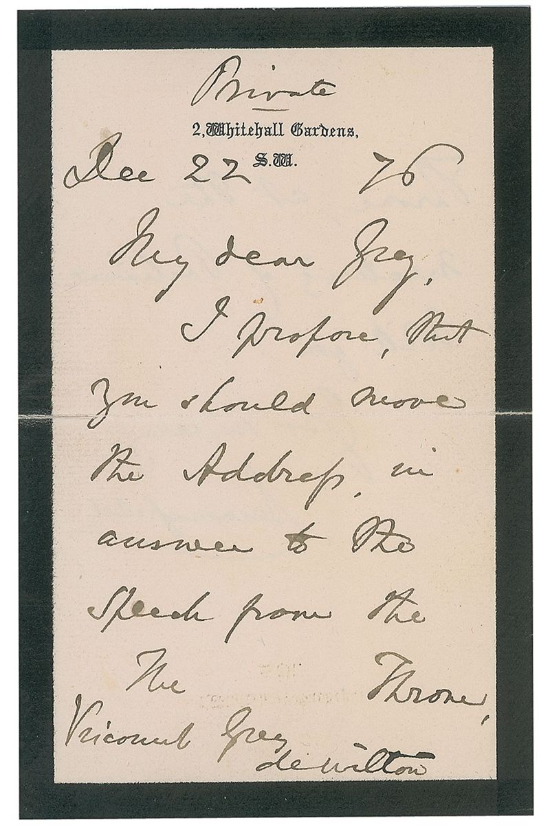 ALS signed “Beaconsfield,” 4.5 x 7, black-bordered personal letterhead, December 22, 1876. Letter to Viscount Grey de Wilton. In part: “I propose, that you should move the Address in answer to the speech from the…Throne, at the meeting of Parliament.” In fine condition. Accompanied by the original mailing envelope, addressed in his own hand and franked in the lower left, “Beaconsfield”; the envelope also retains its original black wax seal, impressed with a coat of arms.