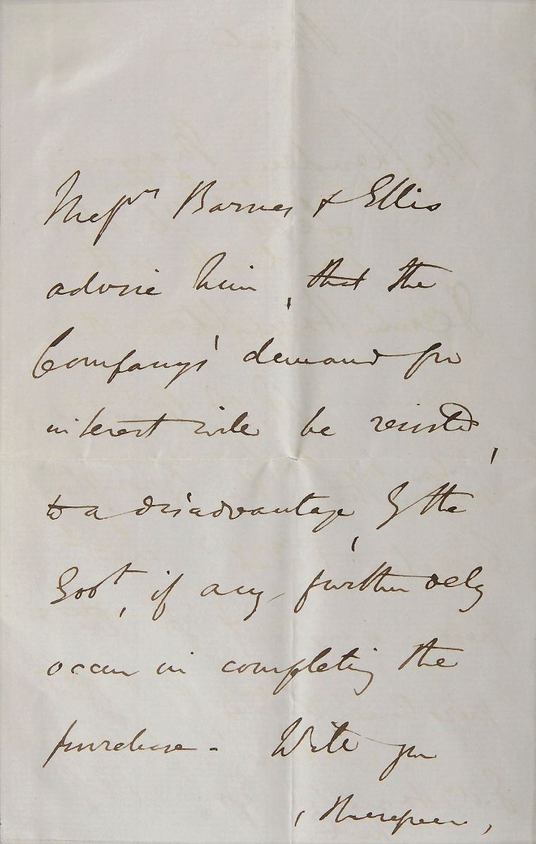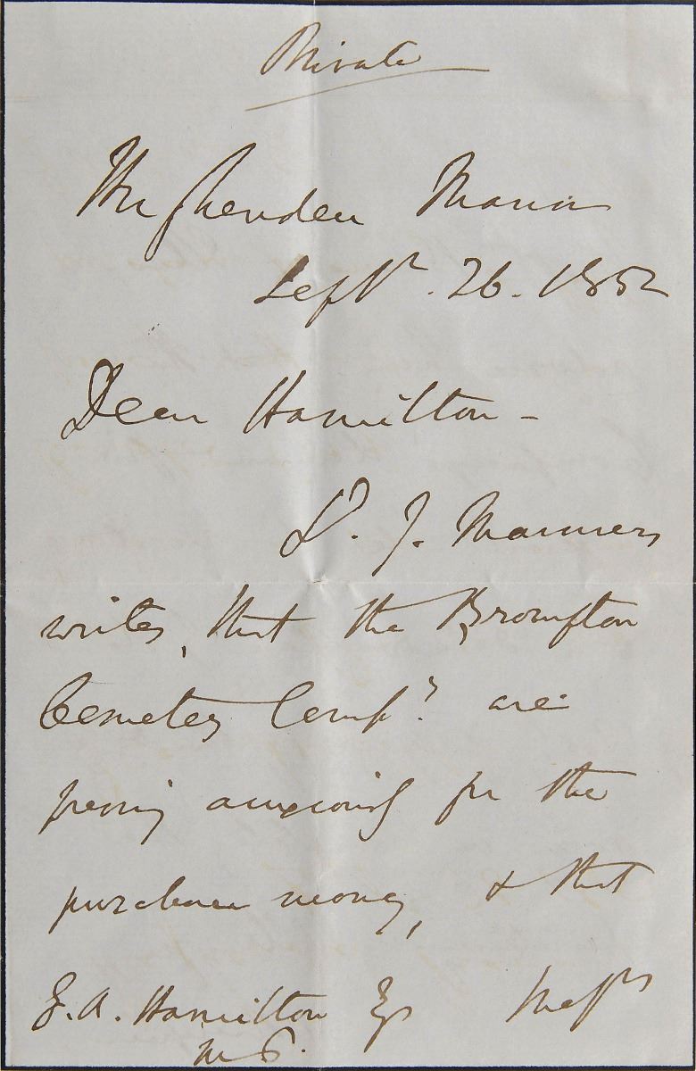 ALS signed “D,” four pages on two adjoining black-bordered sheets, 4.5 x 7, September 26, 1852. Letter to Parliamentary Secretary of the Treasury George A. Hamilton, marked “Private,” in full: “L’d. J. Manners writes, that the Brompton Cemetery Comp’y are pressing anxiously for the purchase money, & that Messrs. Barnes & Ellis advise him, that the Company's demand for interest will be resisted, to a disadvantage, by the Govt, if any further delay occur in completing the purchase. Will you therefore, see to this? The death of the Duke ought to be the removal of an obstacle to military economy. Keep yr eye awake to all this—L’d Hardinge, I fear, is very prone to expenditure—He must be met sternly. Look to the evidence given before the Committee on Army estimates on the junction of the H[orse] Guards & Ordnance departments. We shall be pressed on this head. And keep yr eye increasingly on the expenditure for public works so that the reductions, we talked of this year, may be achieved.” In fine condition, with moderate intersecting folds. Accompanied by the original mailing envelope, signed and addressed in Disraeli’s own hand, “B. Disraeli,” and bearing a black wax seal stamped “Hughenden Manor.”