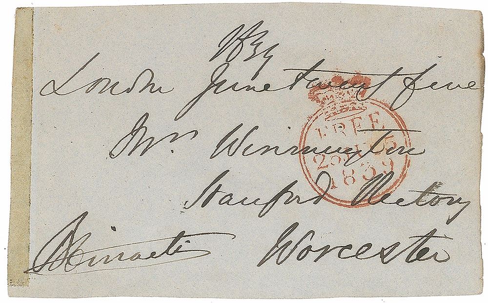 Hand addressed and signed mailing panel, 4.75 x 3, addressed and dated in Disraeli's hand, "London, June twenty five, 1839, Mr. Winmington, Stanford Rectory, Worcester," and signed in the lower left corner, "B. Disraeli." In very good to fine condition, with trimmed edges, and old clear tape along the left side.