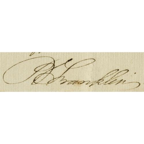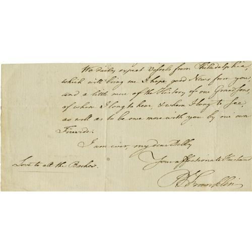 <B>Benjamin Franklin Autographed Letter Signed to His Wife, Written from London Shortly Before the Beginning of the Revolutionary War.</B></I> Franklin, Benjamin. Signer of the Declaration of Independence, statesman, inventor, printer. The concluding portion of an Autograph Letter Signed, 1 page measuring 3.75" x 7.375" oblong, written from London circa 1774, to his wife Deborah; it contains about 6 1/2 lines and over 60 words in Franklin's hand, written to his wife at home in Philadelphia while he was living in England. The letter reads: <I>"We daily expect vessels from Philadelphia, which will bring me, I hope, good News from you, and a little more of the History of our Grand Sons, of whom I long to hear, & whom I long to see, as well as to be once more with you by our own Fireside. I am Ever, my dear Debby, Your affectionate Husband B. Franklin Love to all the Baches."</B></I> By "the Baches" her refers to his daughter Sarah, her husband Richard Bache and their family, probably the grandsons he wishes news of. This was written less than a year before Franklin returned to Philadelphia after spending most of the years from 1757-1775 in England. Earlier, at the time of a return home in 1762, Franklin had thoughts of moving permanently to England; but later he began to think differently, less favorably, of it. Over the years he had various formal assignments there, but he also tried to facilitate the increasingly divergent American and British viewpoints. Early in 1774 an episode occurred which almost forced Franklin to leave England: his involvement in the publication of confidential letters from Gov. Thomas Hutchinson of Massachusetts to the British government. He weathered that storm but by early 1775 a war seemed likely, and reconciliation so unlikely, that Franklin returned home. Fine condition.