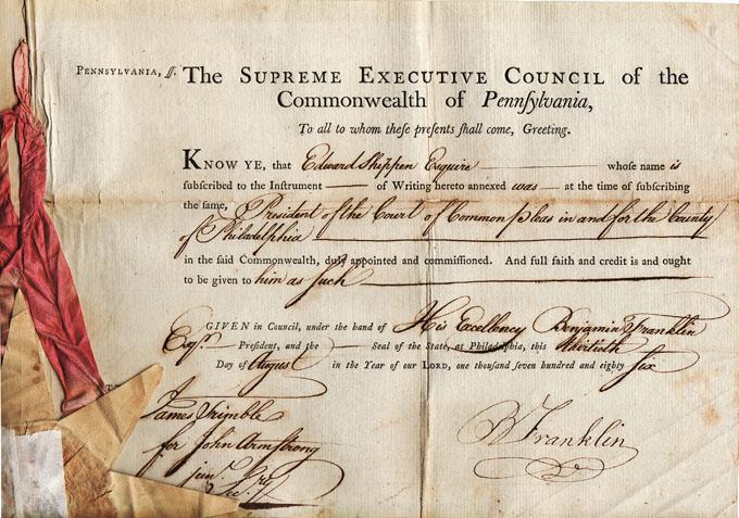 Benjamin Franklin document signed as Governor of Pennsylvania, dated 30 August 1786, appointing Edward Shippen President of the Court of Common Pleas for Philadelphia. Document reads, ''The Supreme Executive Council of the Commonwealth of Pennsylvania, To all to whom these presents shall come, Greeting. Know Ye, that Edward Shippen Esquire whose name is subscribed to the Instrument of Writing hereto annexed was at the time of subscribing the same, President of the Court of Common Pleas in and for the County of Philadelphia in the said Commonwealth duly appointed and commissioned. And full faith and credit is ought to be given to him as such. Given in Council, under the hand of His Excellency Benjamin Franklin Esq. President, and the Seal of the State, at Philadelphia, this thirtieth Day of August in the Year of our Lord, one thousand, seven hundred and eighty six.'' Signed boldly ''B. Franklin'', and also signed by James Trimble for John Armstrong as Junior Secretary. Original State seal is affixed to left margin of document in white paper over red wax. Seal contains a small crack, though still intact and in very good condition. Also includes a companion document, a land grant dated 26 August 1786, signed by aforementioned Edward Shippen. Near fine condition.