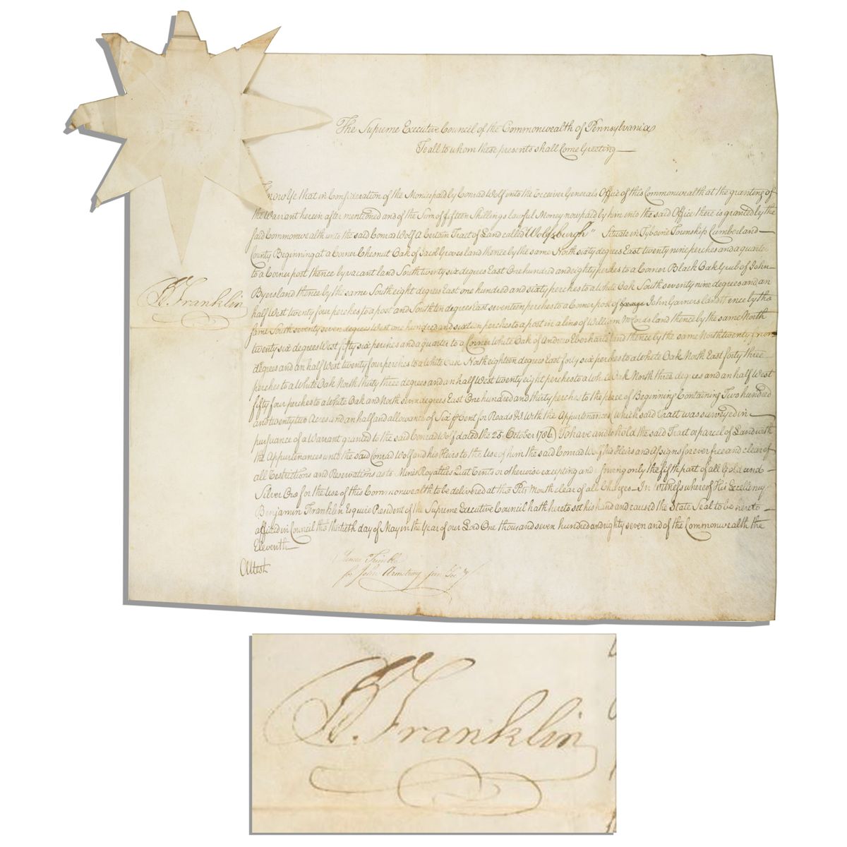 Benjamin Franklin document signed ''B. Franklin'' as Governor of Pennsylvania. Land grant document on vellum is dated 30 May 1787, bestowing a tract of land termed, ''Wolfsburgh'' upon Conrad Wolf. Countersigned by James Trimble for Secretary John Armstrong Jr. Single-page document features a paper seal and measures 13.5'' x 15.5''. Framed with an engraved portrait of Franklin. Folds, else near fine.