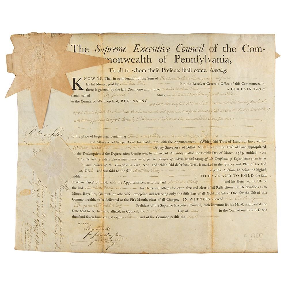 Partly-printed vellum DS, signed “B. Franklin,” one page, 16 x 13.75, May 30, 1786. As president of Pennsylvania's Supreme Executive Council, Franklin issues a land grant to Matthias Keely “a Certain Tract of Land, called ‘Hopewell’ situate on the North West Side of the River Ohio, in the County of Westmoreland…containing Two hundred and seven acres and eighty Six perches.” Signed prominently on the left side by Benjamin Franklin, and countersigned below by James Trimble. The left side retains two of the original paper seals. In fine condition.