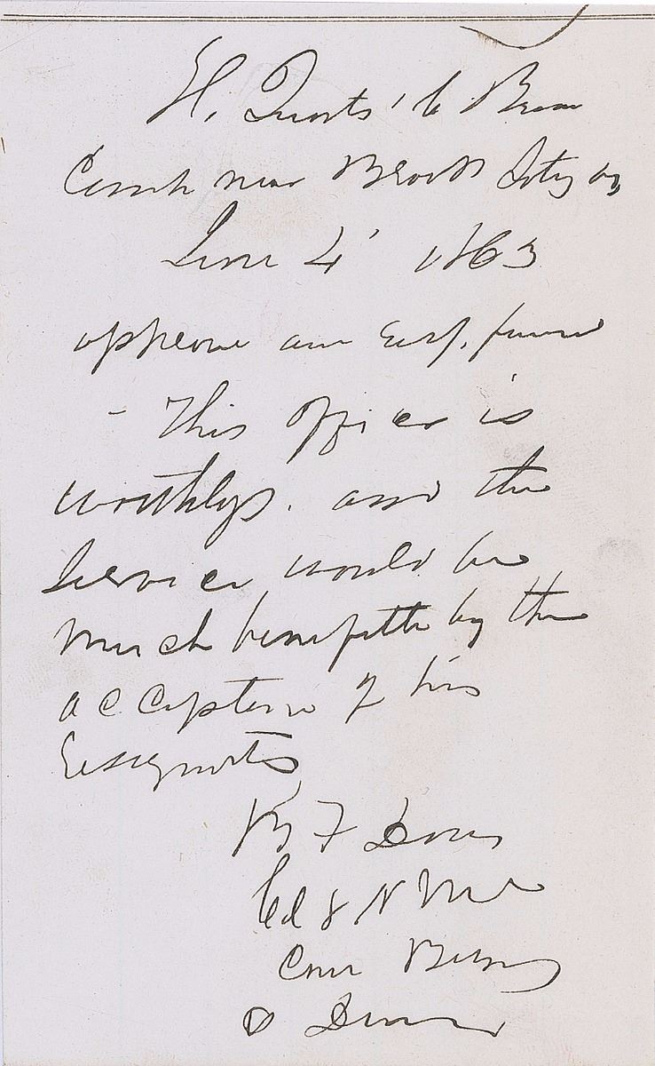 Union cavalryman (1832–1863) considered the first Union officer killed in the Gettysburg Campaign. Civil War–dated ANS signed “B. F. Davis, Col. 8 N.Y. Ca., Com. Brigade & Divison,” one page, 3 x 5, June 4, 1863. Note written from “H. Quarts. 1 C. Brigade, Camp near Brooks Station.” In full: “Approved and Resp. Forwarded—This officer is worthy and the service would be much benefitted by the acceptance of his assignments.” In fine condition, with trimmed edges; seemingly clipped from some type of larger letter or document. This dates to just five days before Davis was killed in action at the Battle of Brandy Station at the beginning of the Gettysburg Campaign.
