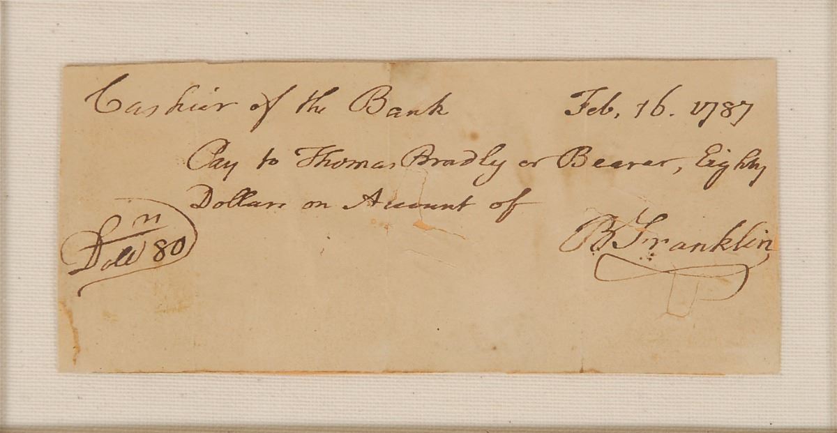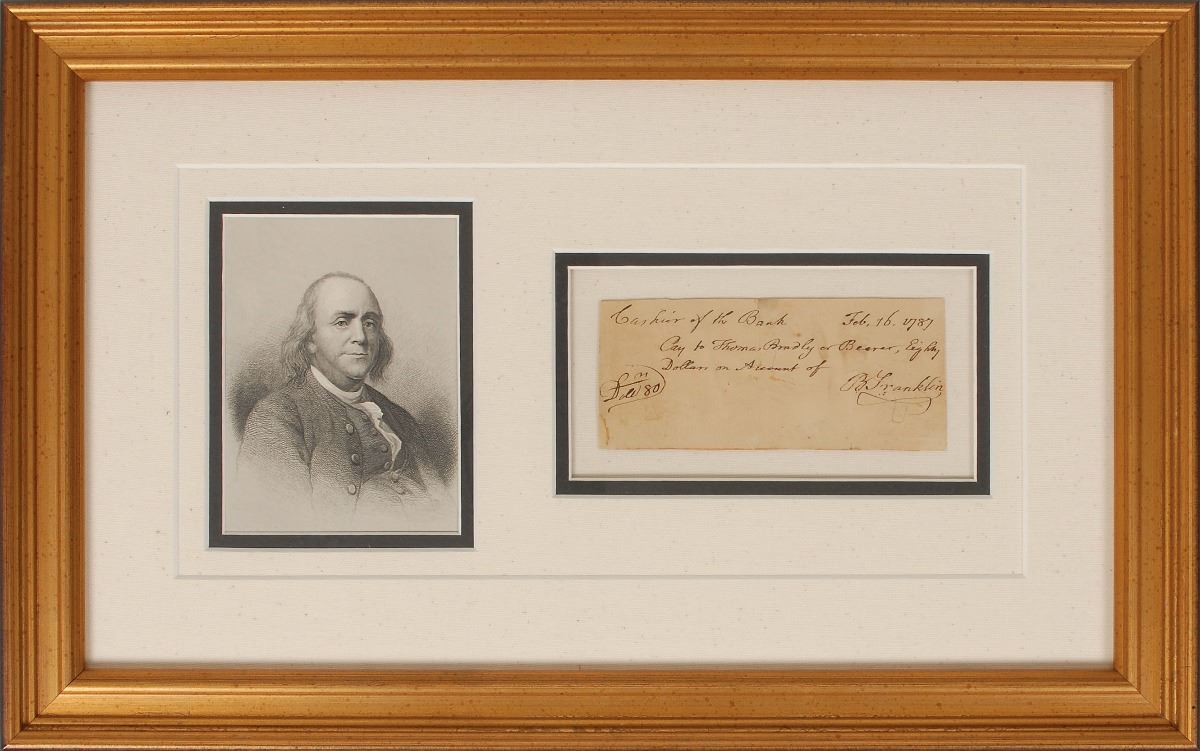 Check, entirely completed by Franklin and signed “B. Franklin,” 5.75 x 2.5, February 16, 1787. In full: “Cashier of the Bank. Pay to Thomas Bradly or Bearer, Eighty Dollars on Account of B. Franklin.” Affixed to a same size cardstock sheet. Handsomely and archivally triple-matted, and framed with an engraving of Franklin to an overall size of 19.5 x 12.25. In very good condition, with cancellation cuts through portions of the body and signature. Just a week before writing this check Franklin had established the Society for Political Enquiries in Philadelphia, an organization dedicated to studying the theory of government. The Constitutional Convention would begin in May, and several members of the society either served as delegates or hoped to influence the outcome through writing in pamphlets and newspapers. An uncommon format from an immensely important period.