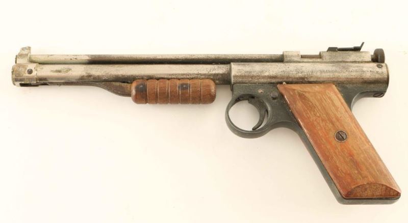 Vintage single shot pump-action pneumatic bb pistol chambered for .177 caliber ammunition. Features a nickel plated & black finish, 8.6" barrel, blade front sight, adjustable rear sight, smooth trigger, push button safety, knurled cocking piece, alloy grip frame, grooved wood pump handle, and two-piece smooth wood grips. Pistol retains much of it's nickel plated finish on the left side but shows mostly brass on the right side. Action appears to function well, and the wood furniture is good with little finish remaining. Condition is Good.