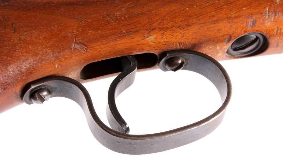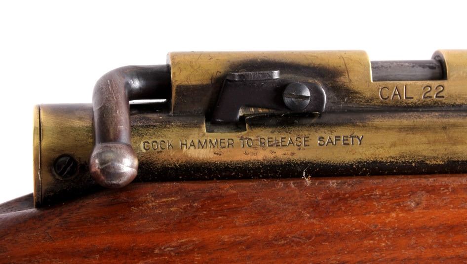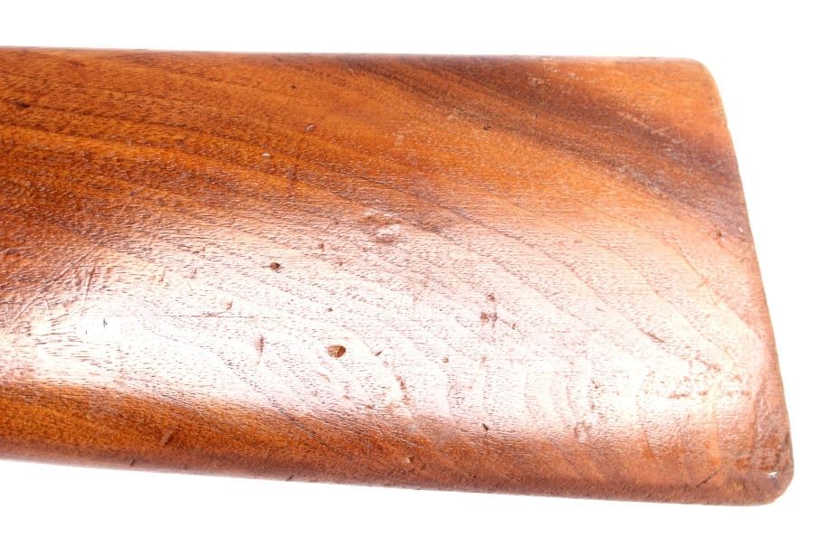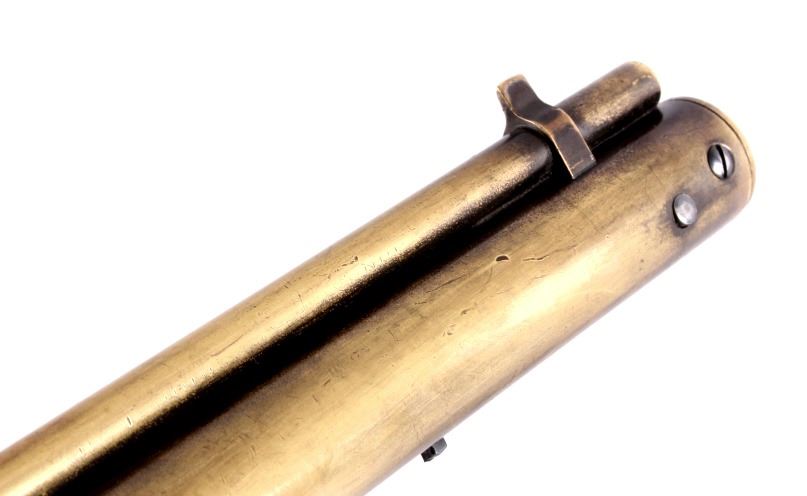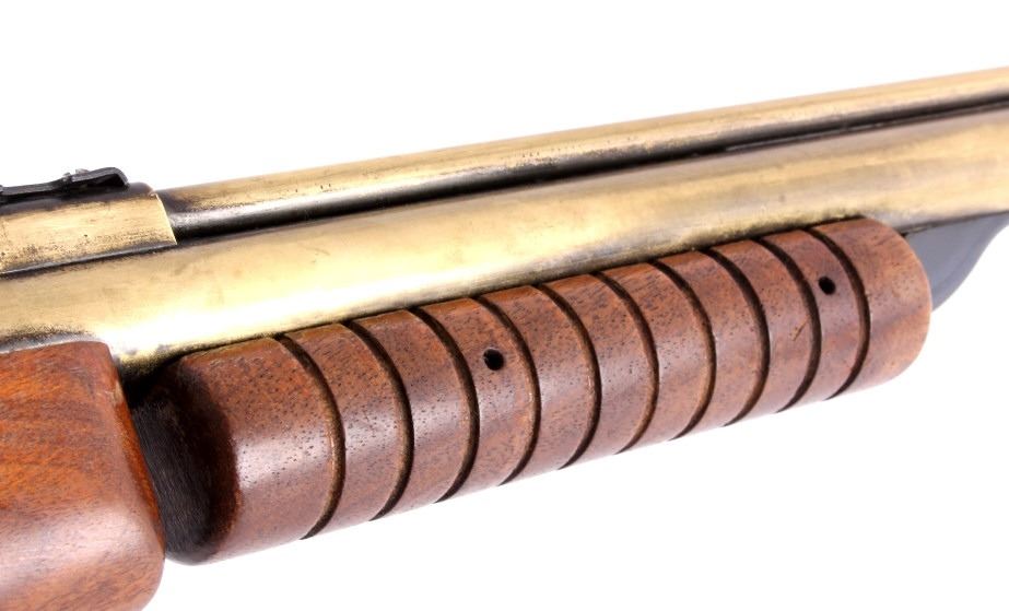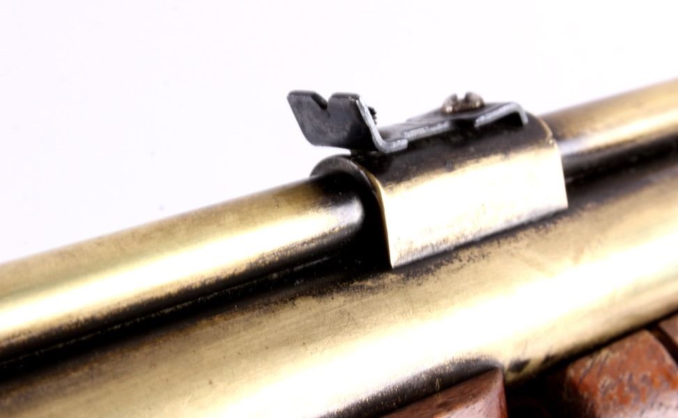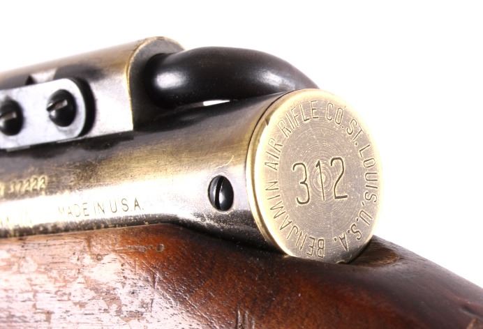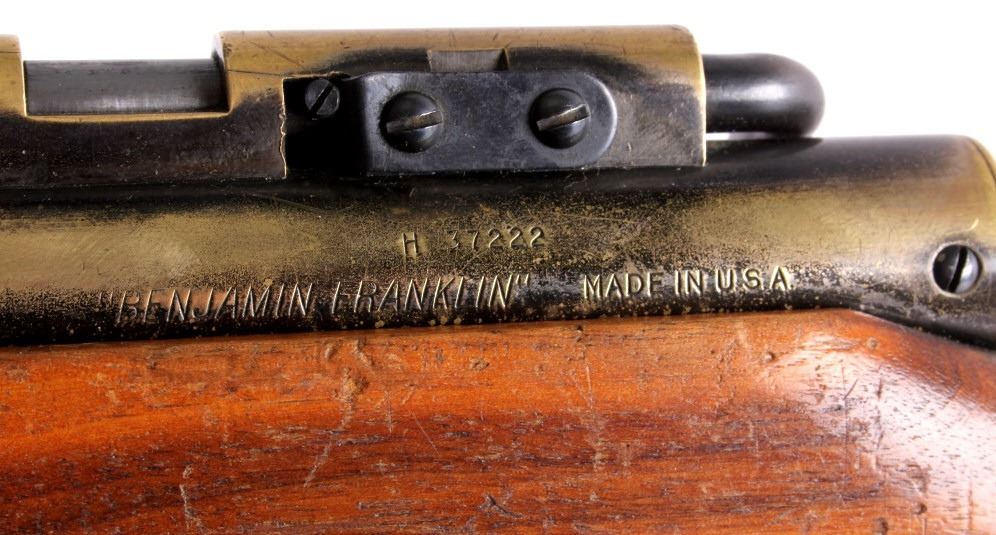 This is a Benjamin Franklin .22 pump action air rifle. The air rifle features a solid wood stock with a brass action. The rifle is marked "Benjamin Franklin Made in U.S.A." and is a model "312". The air rifle is in good condition. It measures 34.75" long.