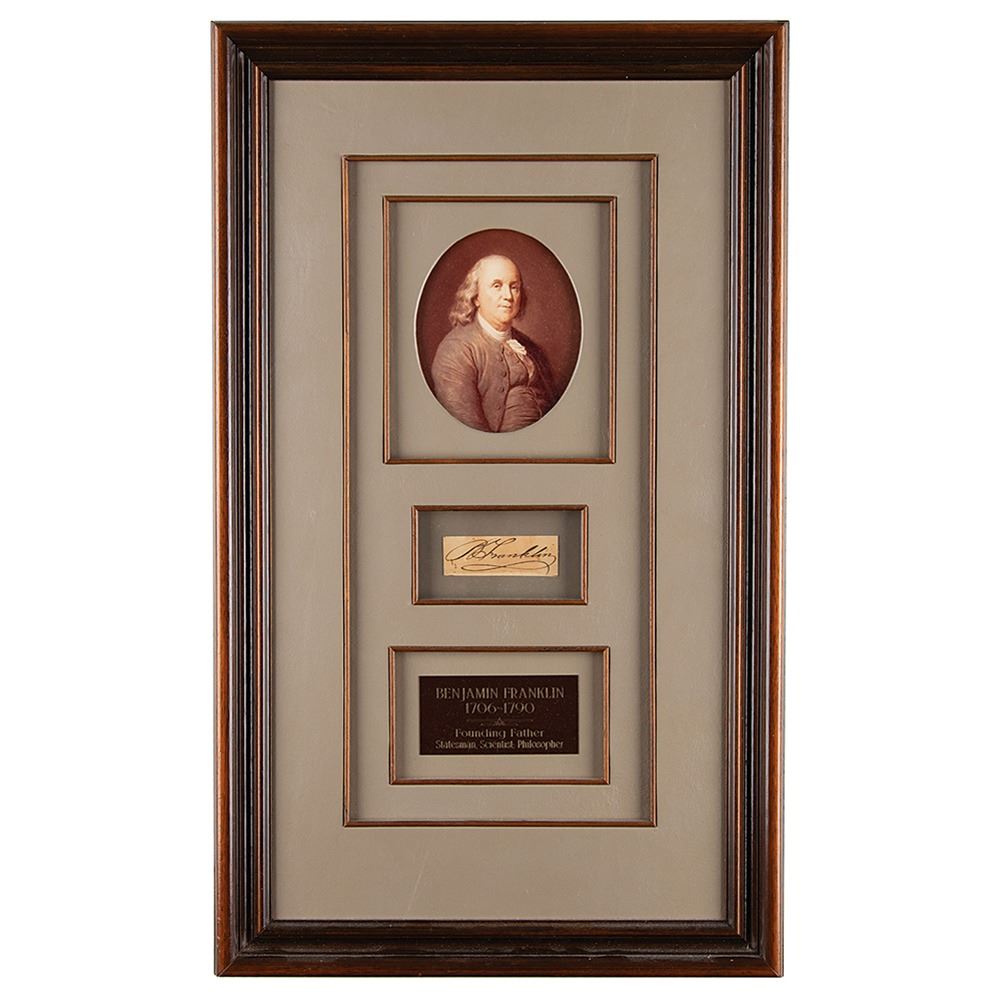 Bold ink signature, "B. Franklin,†on an off-white 3 x 1 slip. Handsomely matted and framed in gray leather with a portrait and plaque to an overall size of 14 x 23.5. In fine condition, with slightly irregular trimming to the bottom edge.