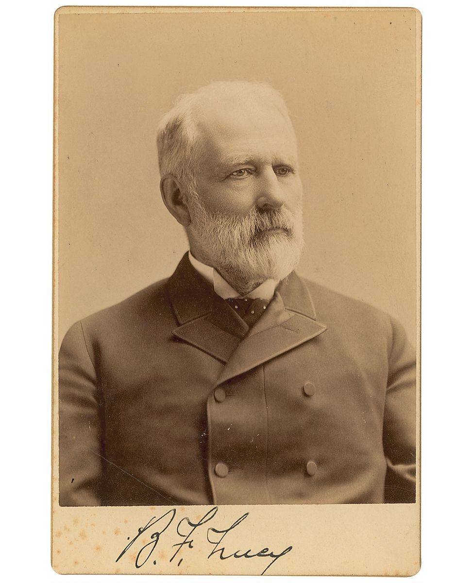 Union general and politician (1830–1915) who was awarded a Medal of Honor for his actions during the Battle of the Wilderness. He later served as Secretary of the Navy under Benjamin Harrison. Original 4 x 6.5 cabinet photo by an anonymous studio, signed in the lower border in black ink, “B. F. Tracy.” Some scattered light surface marks, and light foxing under signature, otherwise fine condition.