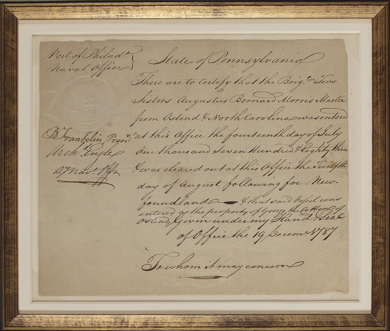 Uncommon partly-printed DS, signed “B. Franklin Pres,” one page, 7.75 x 6.25, December 19, 1787. Ship’s port certification for the ship Two Sisters. Document reads, in part: “These are to certify that the Brig Two Sisters Augustus Bernard Morris Master from Ostend & North Carolina was entered at this office the fourteenth day of July One thousand Seven Hundred & Eighty three & was cleared out at this Office the Twelfth day of August following for Newfoundland & that said vessel was entered as the property of George McCotton of Ostend.” Signed by Franklin beneath the embossed nautical seal on the left side of document, and countersigned by another naval official. Double suede matted and framed with an engraved portrait of Franklin, to an overall size of 15.5 x 23. Intersecting folds, uniform toning with a few heavier spots, a few light creases, and a few small edge tears, otherwise fine condition.