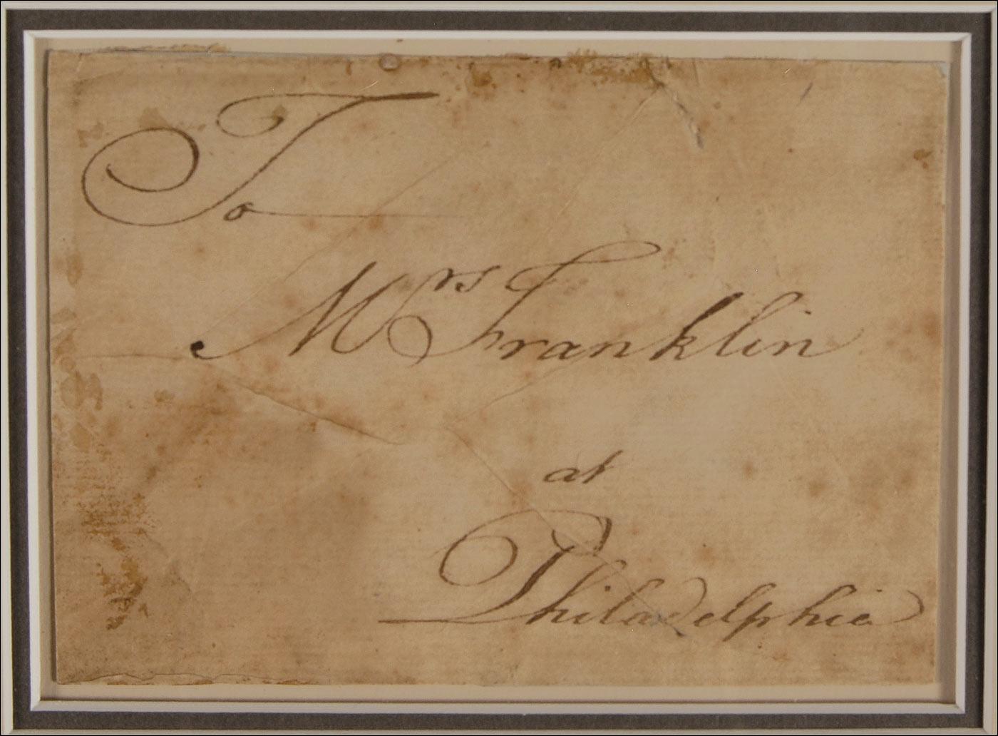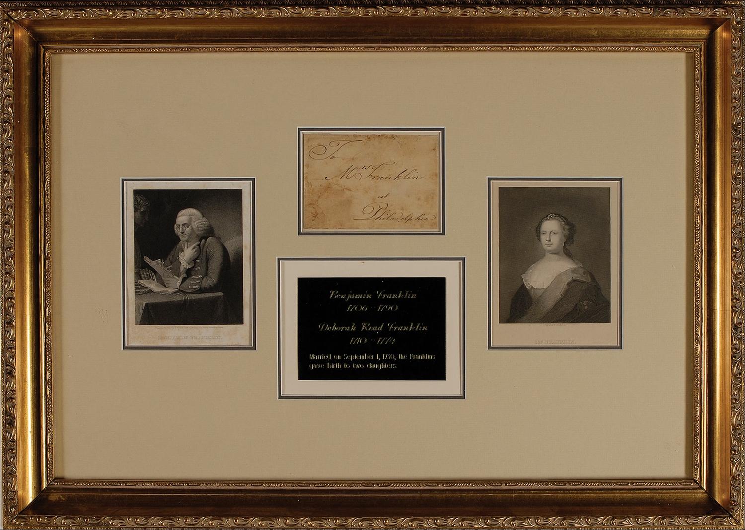 Hand-addressed address leaf, 4.5 x 3, addressed by Franklin, “To Mrs. Franklin at Philadelphia.” Double matted and framed with engraved portraits of Benjamin and Deboarah Franklin and a name plaque, to an overall size of 25 x 18. Scattered creases affecting several words, a few small edge tears, and scattered soiling and toning, otherwise very good condition.