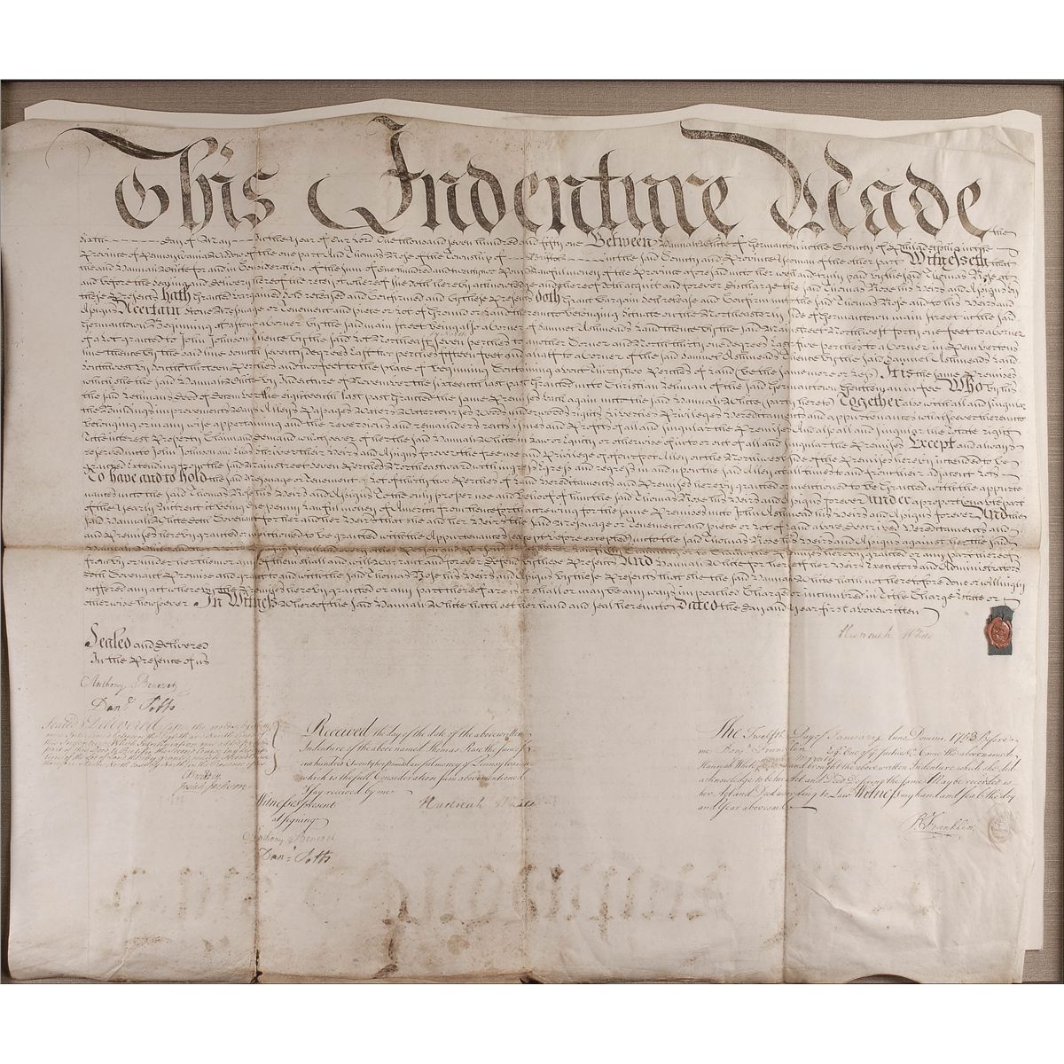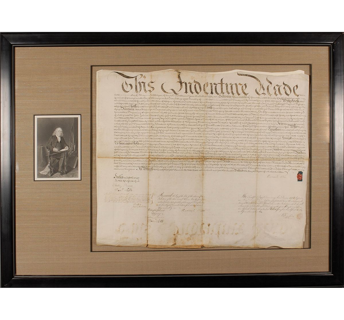 Impressive twice-signed manuscript DS on vellum, signed “B. Franklin” and “Benj. Franklin,” one page, 26 x 21.5, January 12, 1753. An indenture wherein “widdow” Hannah White of Germantown [Pennsylvania] transfers to Thomas Rose of Bristol a parcel of land “for the consideration of the sum of one hundred and twenty two pounds lawful money.” Franklin signs twice, within (“Benj. Franklin”) and following (“B. Franklin”) a statement of witness. Two seals, one wax and one wax and paper, remain intact near the right edge. Handsomely matted and framed with a nineteenth-century portrait engraving to an overall size of 43 x 32. In very good condition, with heavy folds (one touching the last name of ‘internal’ signature, toning, separations at intersections of folds (affecting a few words), and scattered soiling and spotting, as well as mirroring of text to blank lower margin.