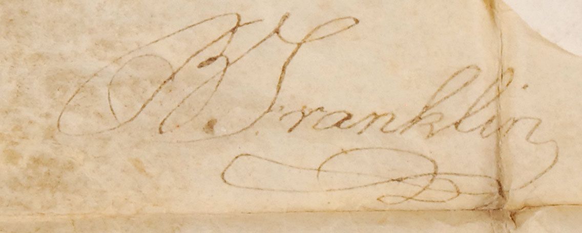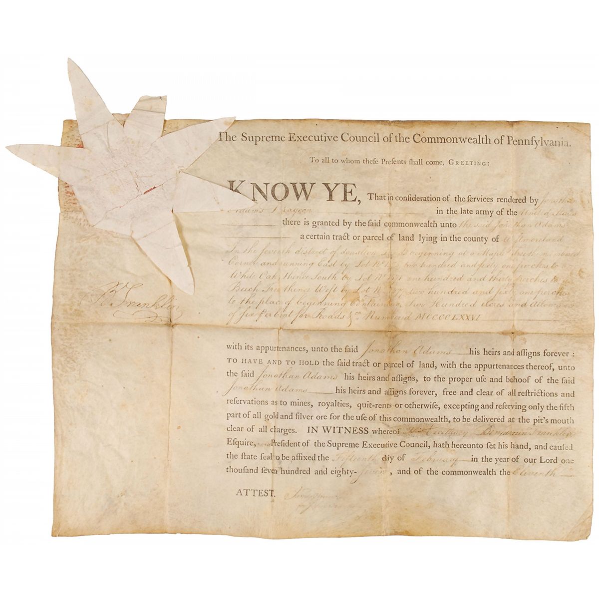 Partly-printed DS, signed “B. Franklin,” one page, 15 x 11.75, February 15, 1787. A land grant issued “for consideration of services rendered by Jonathan Adams Dragoon in the late army of the United States” a tract of land in Westmoreland County “in the seventh district of donation,” described as running from a maple tree to a white oak to a beech tree and back to the maple, totaling 200 acres. Signed in the left border by Franklin as president of the Supreme Council of the Commonwealth of Pennsylvania. Intersecting folds, one through a single letter of signature, scattered moderate toning and soiling, expected wrinkling, and a few small pin-size holes, otherwise very good condition. The eight-point star seal is worn and creased, with two missing points, and one other missing point tip.