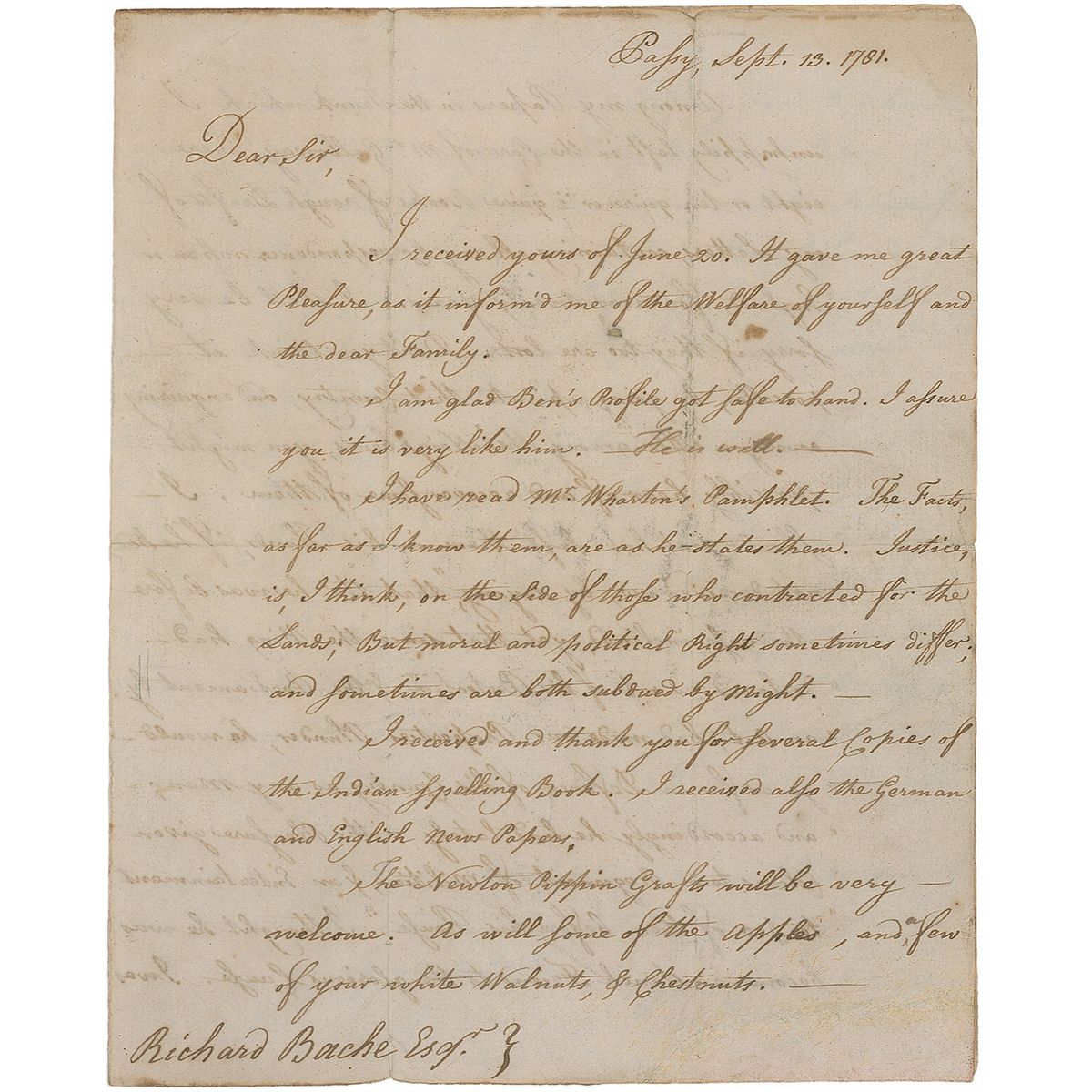 Revolutionary War–dated LS signed “B. Franklin,” three pages on two adjoining sheets, 7.25 x 9, Passy, France, December 13, 1781. Letter to his son-in-law, Richard Bache. In full: “I received yours of June 20. It gave me great Pleasure, as it inform'd me of the Welfare of yourself and the dear Family. I am glad Ben's Profile got safe to hand. I assure you it is very like him. He is well. I have read Mr. Wharton's Pamphlet. The Facts, as far as I know them, are as he states them. Justice, is, I think, on the Side of those who contracted for the Lands; But moral and political Right sometimes differ; and sometimes are both subdued by Might. I received and thank you for several Copies of the Indian Spelling Book. I received also the German and English News Papers. The Newton Pippin Grafts will be very welcome. As will some of the Apples, and a few of your white Walnuts, & Chest-nuts.